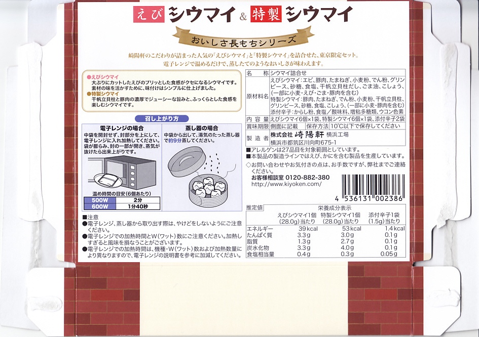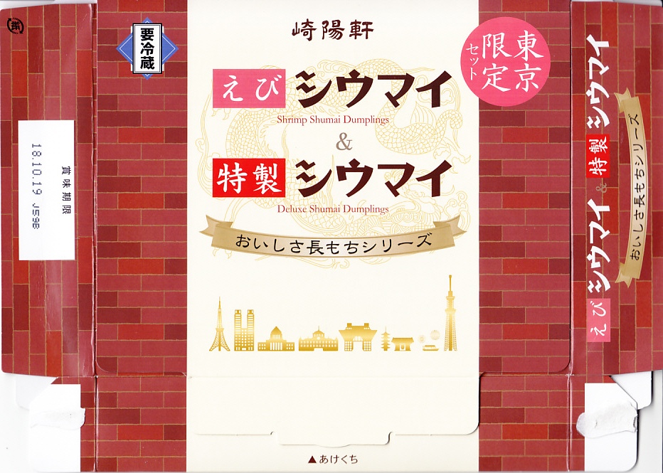 崎陽軒の東京駅「グランスタ」地下1階の食品売り場での店舗の開業を記念し、2018(平成30)年10月1日に「東京限定」で発売。商品名のとおり、同社の「おいしさ長もちシリーズ」で既存の「えびシウマイ」と「特製シウマイ」の6個入りパックを各1袋ずつ収めた。冷蔵で売られ、電子レンジでの加熱を推奨する惣菜。