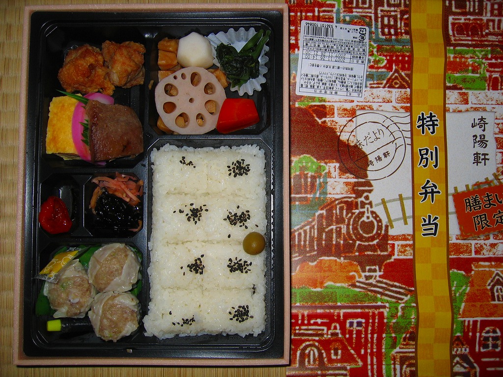 東京都内の駅弁売店「膳まい」でのみ販売されている、崎陽軒東京工場の幕の内弁当で、下記の商品「特別弁当」を2011年または2012年にリニューアルか。掛紙の意匠や商品名が変わったり、容器が発泡材からボール紙製に変わったが、価格やおおまかな内容は変わらない。日の丸俵飯にロースカツ、アジフライ、赤魚照焼、鶏唐揚、シイタケやサトイモなどの煮物、きんぴらごぼう、かまぼこと玉子焼、タケノコ煮、シウマイ2個など。