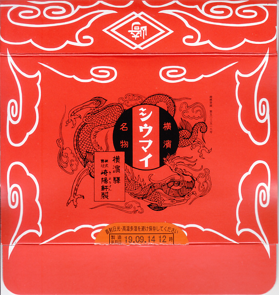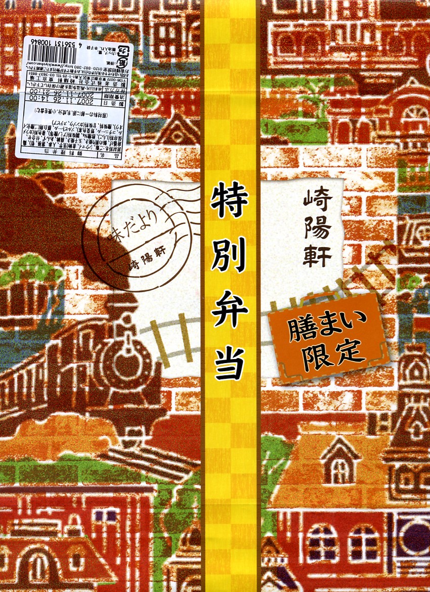 「崎陽軒」「膳まい限定」「特別弁当」「味だより」「御料理弁当」と様々な名称が掛紙に記されて、商品名の選択に困るが、つまり東京駅の在来線改札内その他に店舗を構えるキヨスク系の弁当売店「膳まい」で売られる崎陽軒の弁当だろう。大きく柔らかい木目調の容器に、駅舎や線路やSLを描いている掛紙を巻く。おそらく2011年か2012年に上記の弁当「崎陽軒幕の内弁当」へリニューアルされた模様。