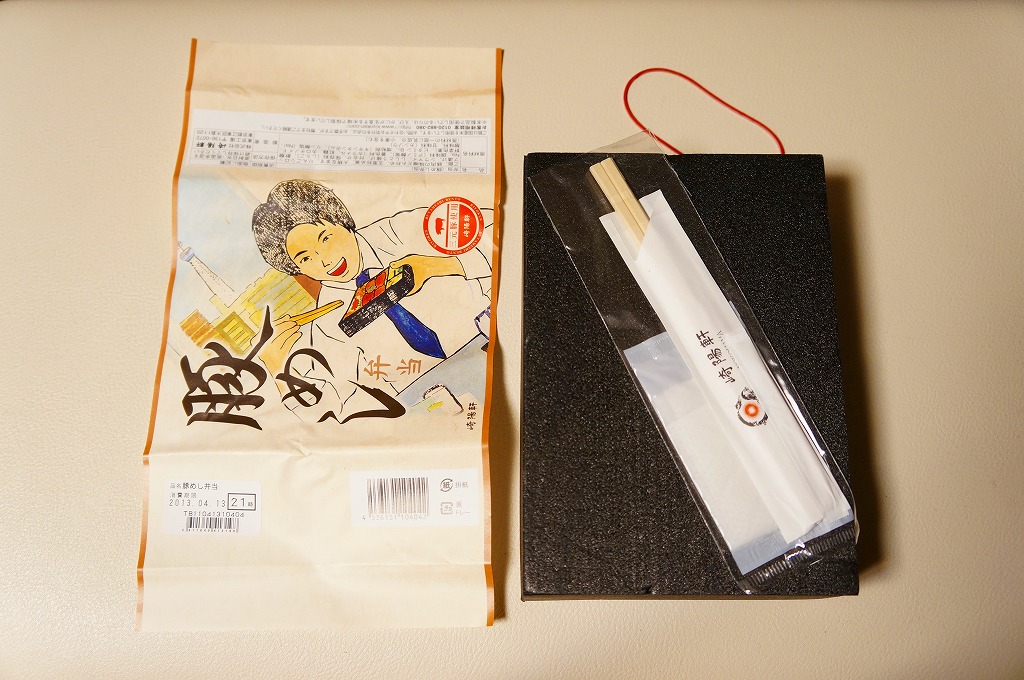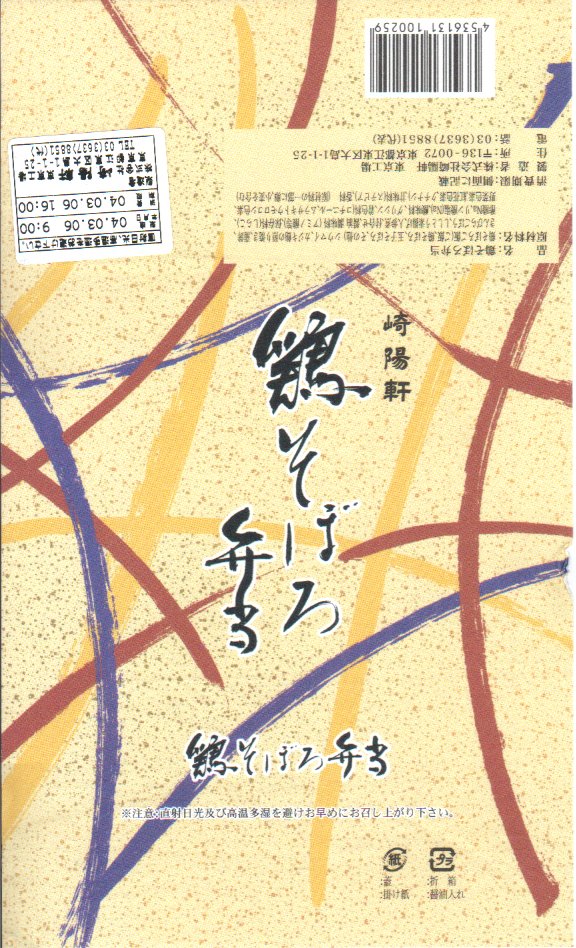 横浜では販売されていない崎陽軒東京工場のお弁当で、これは品川駅ビル食品売場内崎陽軒ブースで購入。真っ黒で木目の浮き出た重厚な長方形の容器に和風な凹凸のある掛紙をかけて金色の輪ゴムでしばる。中身は鶏そぼろと玉子そぼろが乗ったちょっと甘辛な鶏御飯に、カジキマグロ照焼や蒲鉾とシウマイ2個を添えるもの。どう見ても横浜駅弁にしか見えないのだが、やっぱり横浜駅弁でない。2010年頃までの販売か。