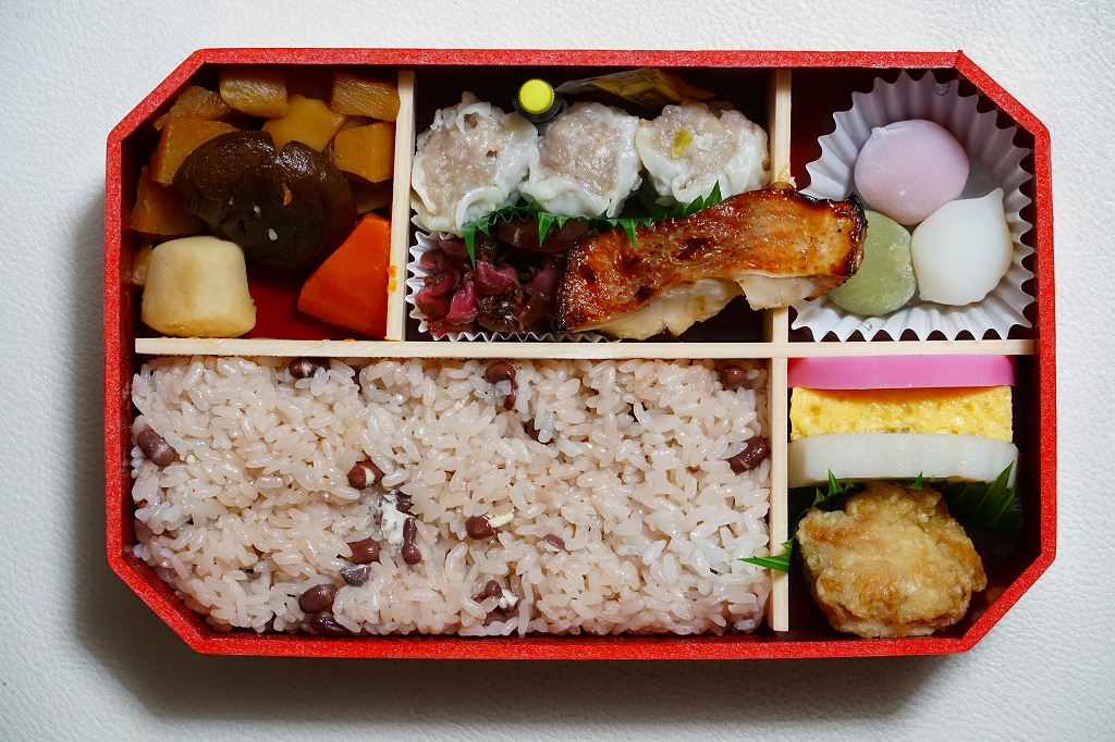 2008年の横浜駅弁「お赤飯弁当」に使われたような、ふたの花柄が華やかな赤い容器に、赤飯を詰めて胡麻塩の袋を添付し、赤いかまぼこと白いれんこんと玉子焼、鶏唐揚、しいたけと里芋とにんじんの煮物と筍煮、赤魚照り焼き、柴漬け、シウマイ3個と辛子と醤油、一口サイズの三色団子を添える。横浜駅のどんなお弁当よりも高額な1,580円もの価格を付けた、上等の赤飯弁当。