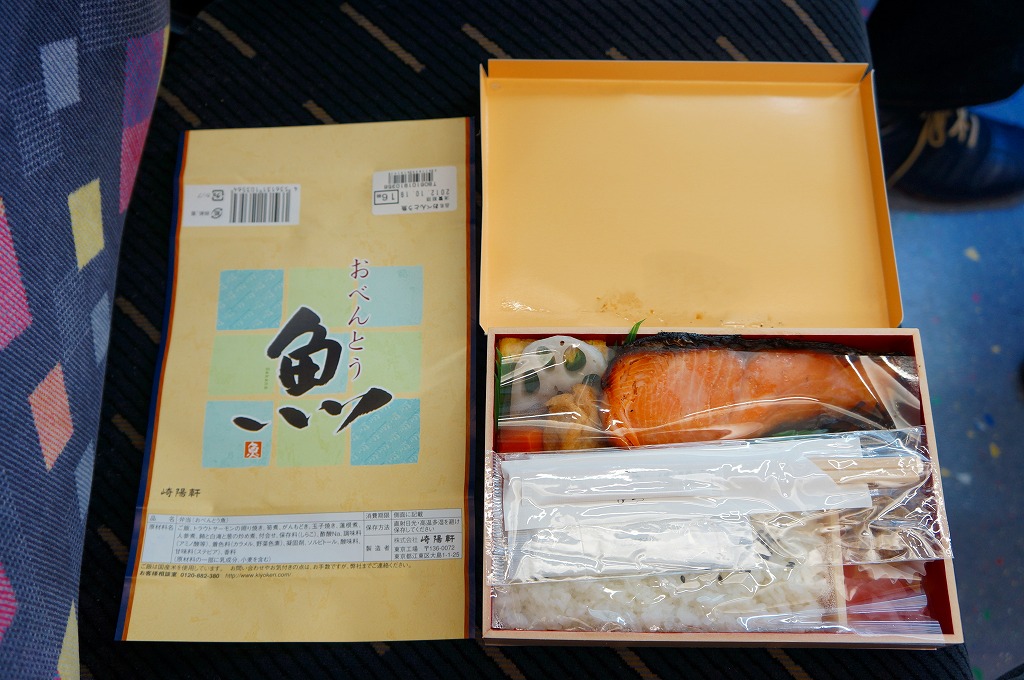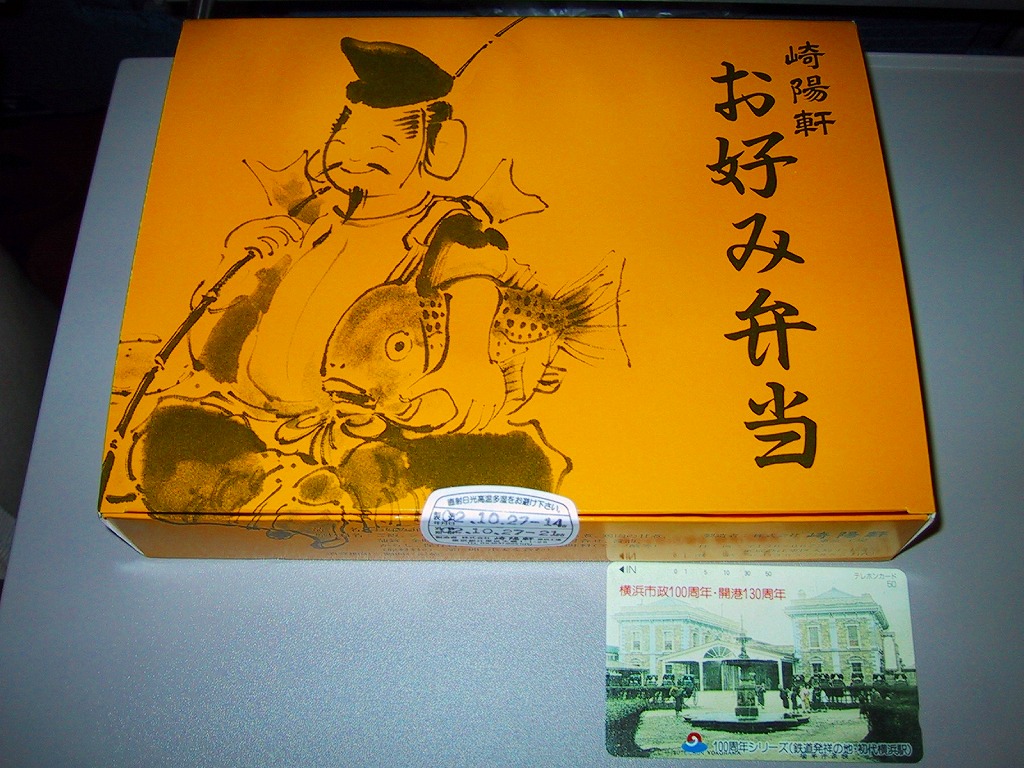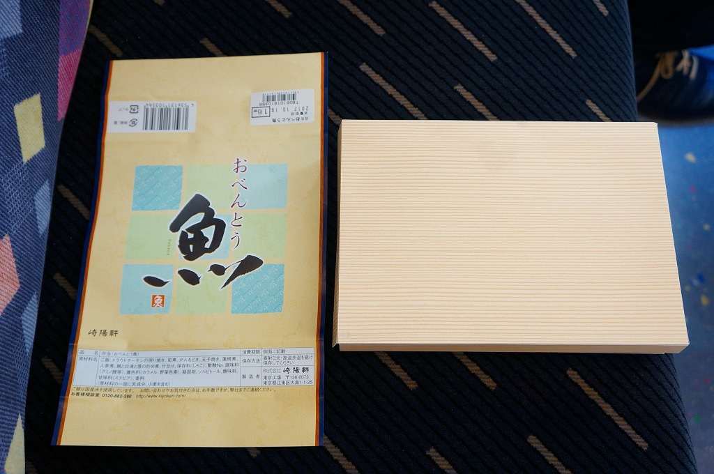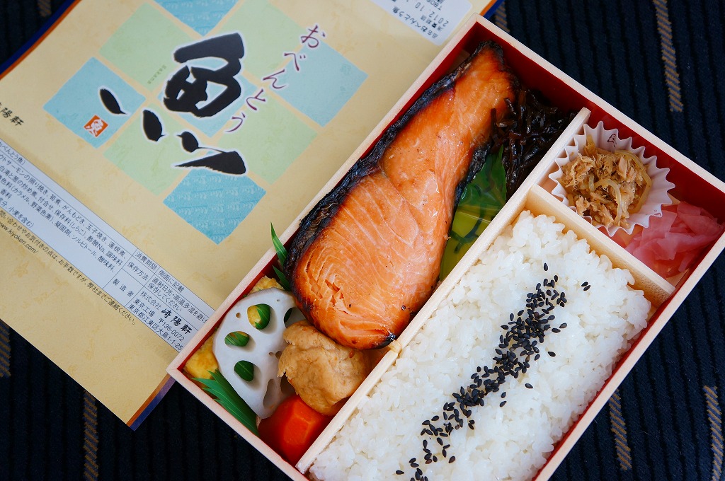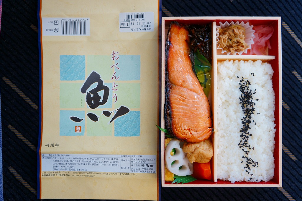 商品名をシンプルにデザインした掛紙に包まれる長方形の折り箱には、胡麻ふり白御飯、トラウトサーモンの風味照焼、まぐろフレーク、玉子焼、ニンジンやレンコンなどの煮物、タケノコ煮、大根桜漬など。かつての上野駅弁「上野弁当」を上回る感じの大きな大きな焼サーモンが大きな存在感。たしかに御飯の具合を除き、崎陽軒らしさが入っていないような感じを受けた。2014年頃まで販売か。