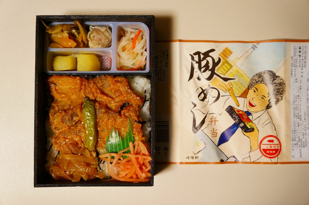 2013(平成25)年3月18日に東京地区で発売。イケメンがオフィスでこの弁当を食べている、微妙なイラストの掛紙を黒い容器に巻く。中身は白御飯に三元豚の味噌だれ炒めを載せ、タマネギ炒めと紅生姜とししとうも置き、大根なます、ザーサイ、リンゴのシロップ漬、シウマイ1個を添えるもの。味は刺激的でなく柔らかいが、飯を進めるコテコテの味。2014年4月の消費税率改定を機に終売か。