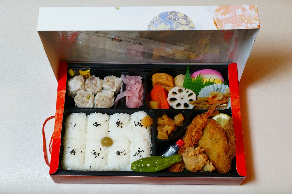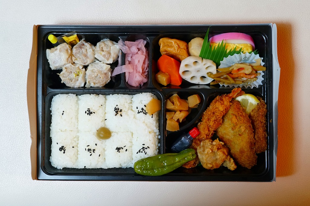 大丸東京店のデパ地下で買えたお弁当。横浜や東京にたくさんある崎陽軒の店舗でも、ここでしか買えないものと思われる。市販の仕出し弁当向け容器をそのまま使う。日の丸俵飯、トンカツとマグロフライとエビフライと鶏唐揚、かまぼこと玉子焼、ニンジンとレンコンの煮物、タケノコ煮、きんぴらごぼう、大根桜漬、シウマイ5個という中身は、横浜駅弁「シウマイ弁当」の上等版に見える、崎陽軒ファンにはうれしい構成。