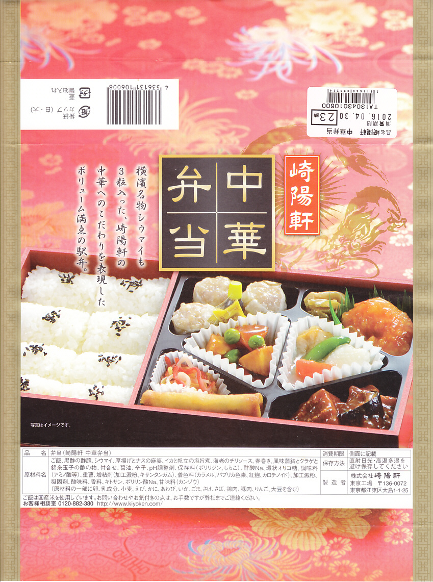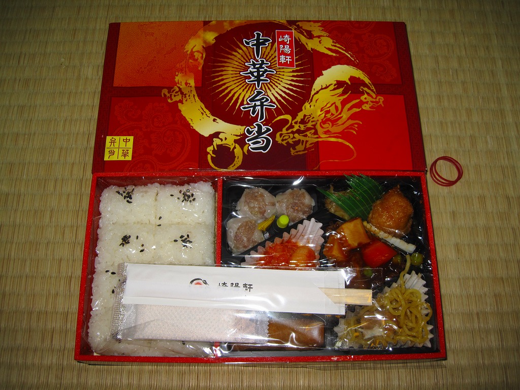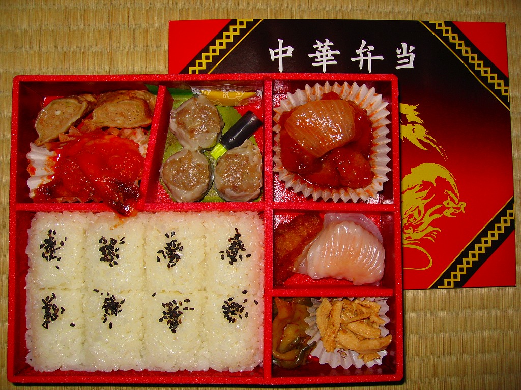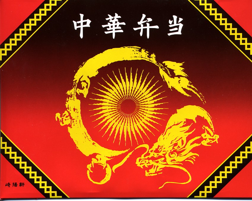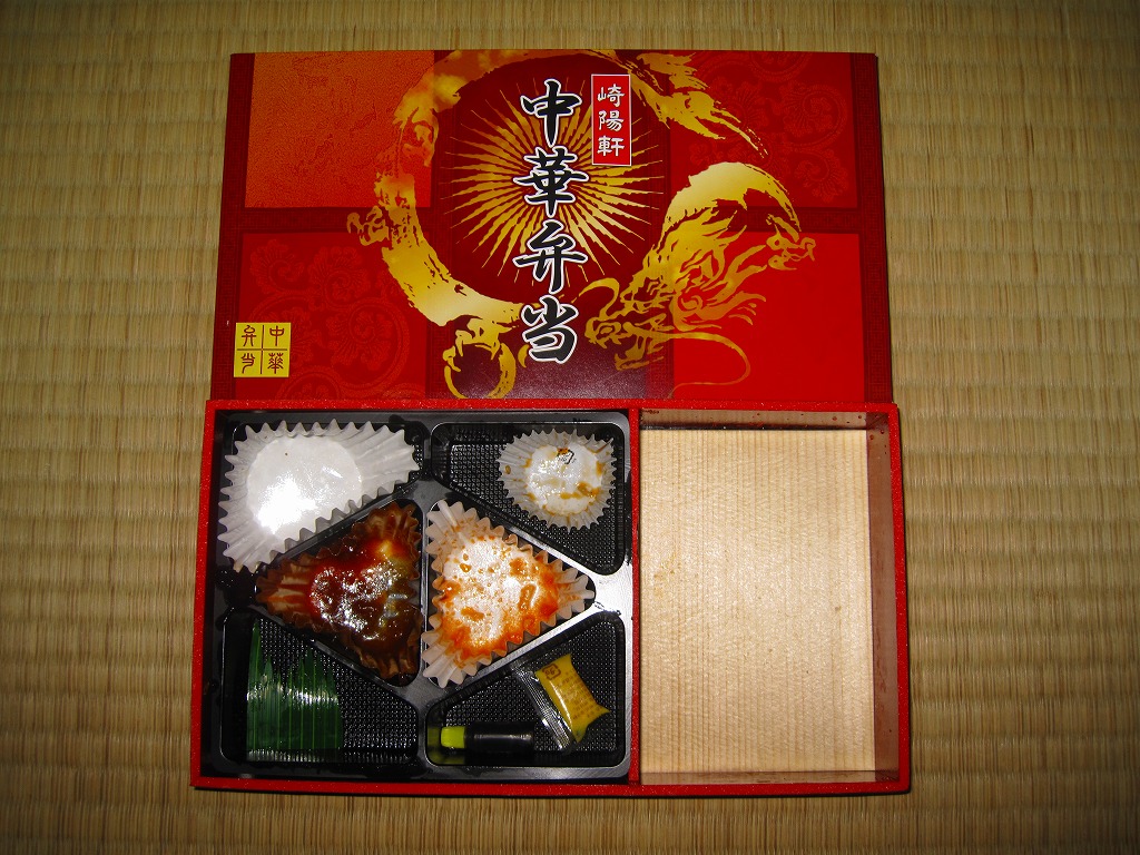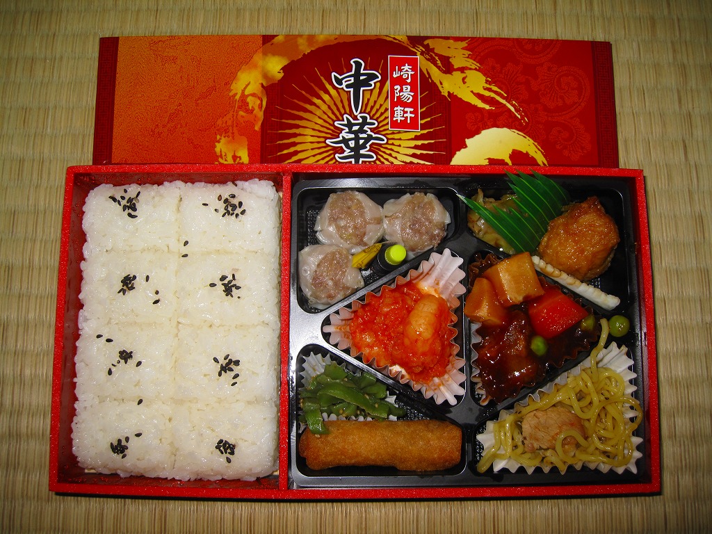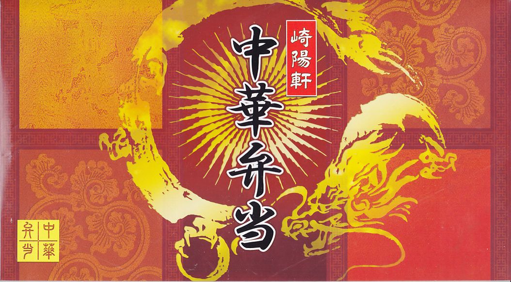 2011(平成23)年3月5・6日に東京駅で開催された第13回東日本縦断駅弁大会で購入できた崎陽軒のお弁当。赤い素材を黒く塗った長方形の容器に、中国らしい絵柄である朱色のボール紙でふたをする。中身は俵型御飯に酢豚、エビチリ、油琳鶏(ユーリンチー)なる鶏肉、イカ煮、春巻、塩焼そば、山クラゲ、ザーサイ、シウマイ3個。同じ調製元とコンセプトの「横濱中華弁当」より、おかずの見栄えも味もこぢんまりしているような。