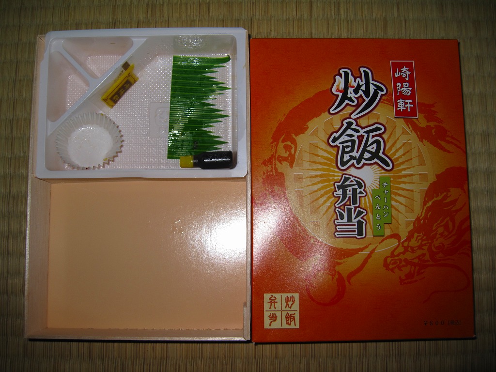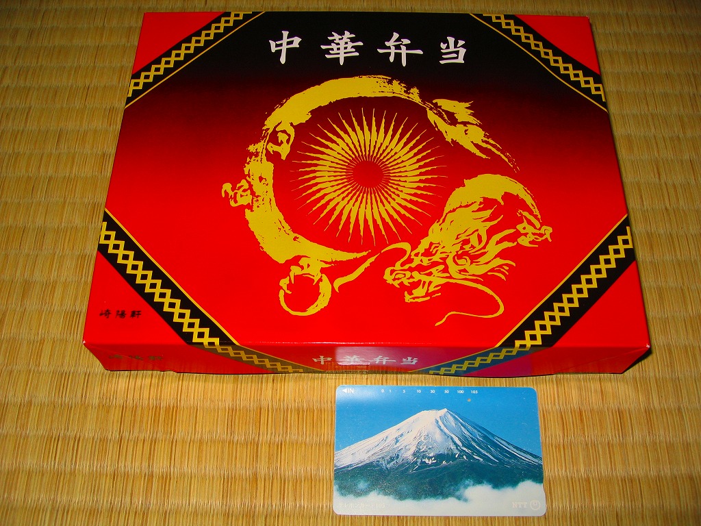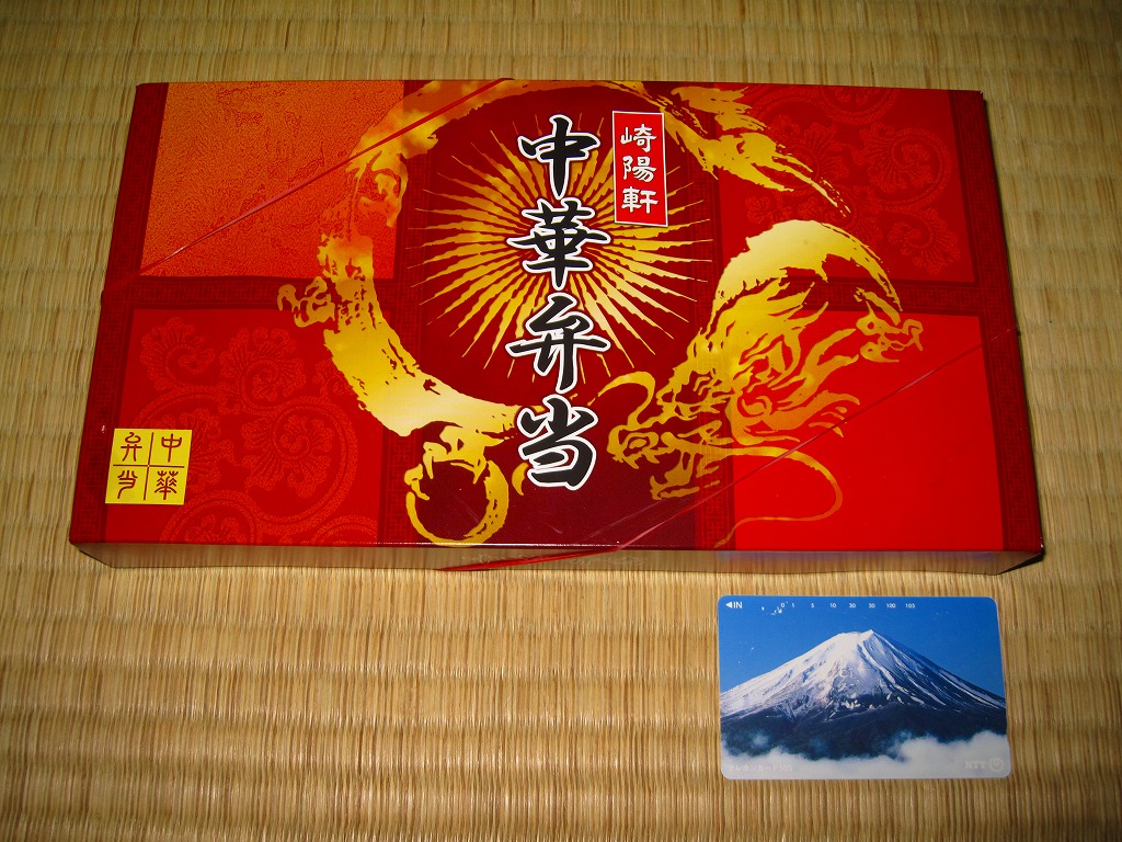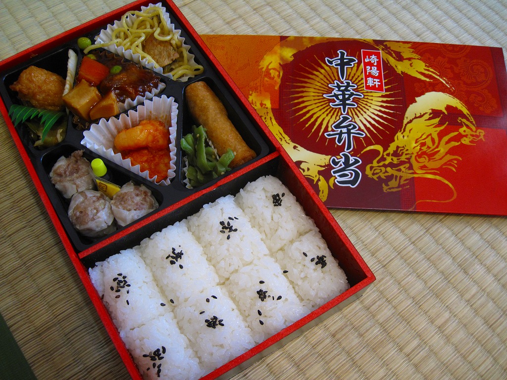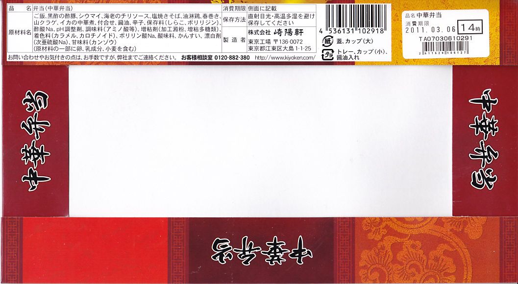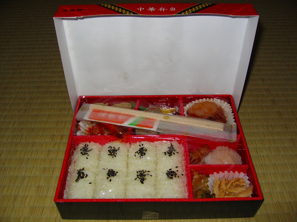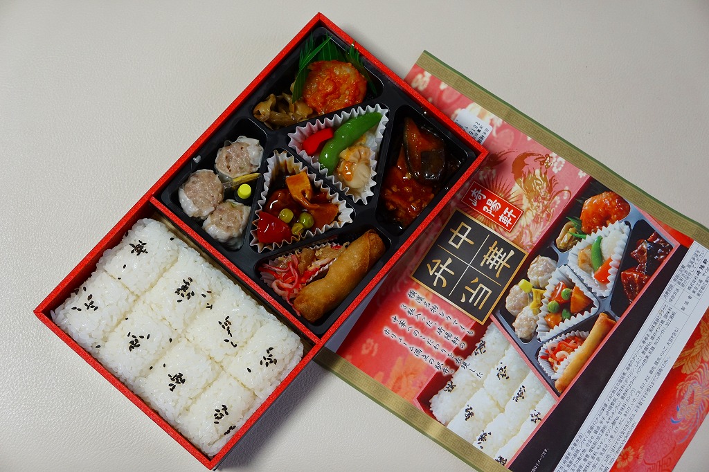 2011(平成23)年3月5・6日に東京駅で開催された第13回東日本縦断駅弁大会で購入できた崎陽軒のお弁当。赤い素材を黒く塗った長方形の容器に、中国らしい絵柄である朱色のボール紙でふたをする。中身は俵型御飯に酢豚、エビチリ、油琳鶏(ユーリンチー)なる鶏肉、イカ煮、春巻、塩焼そば、山クラゲ、ザーサイ、シウマイ3個。同じ調製元とコンセプトの「横濱中華弁当」より、おかずの見栄えも味もこぢんまりしているような。