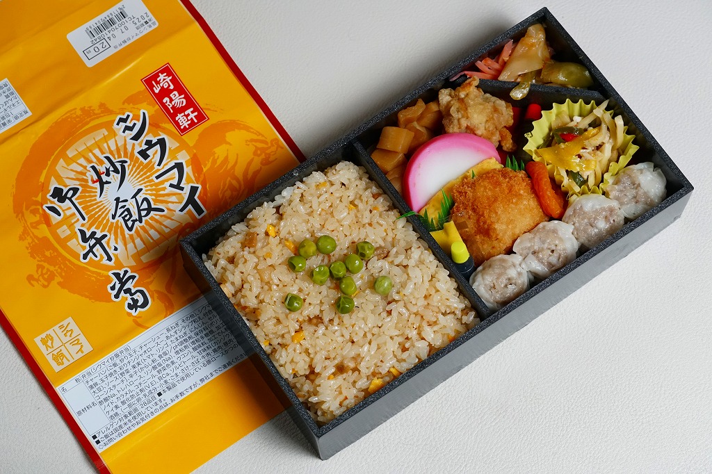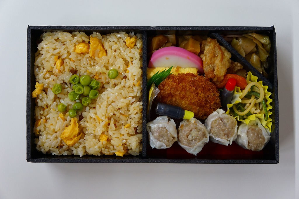 シウマイ弁当サイズの長方形容器に、直にチャーハンを詰め、白いプラ製トレーに鶏唐揚、塩焼きそば、カマボコとクラゲと錦糸卵の酢の物、タケノコ煮、シウマイ3個、紅生姜を詰める。冷蔵でなく常温で売られる、冷めた炒飯弁当。それでも塩気がきつめの炒飯にはパラパラ感があり、一方で「横濱チャーハン」のようにスプーンを添付せず、割りばしでいただける。