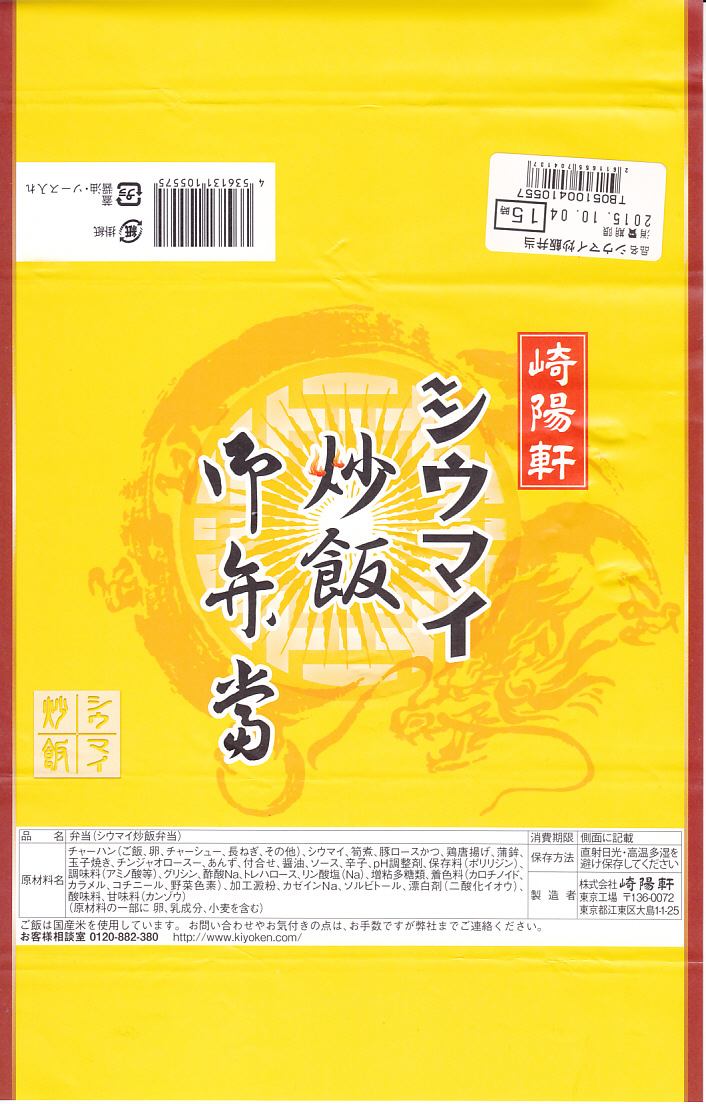 上記の駅弁「シウマイ炒飯御弁當」の、2015(平成27)年の発売時の姿。掛紙の法定表記を除き、何も変わっていない。