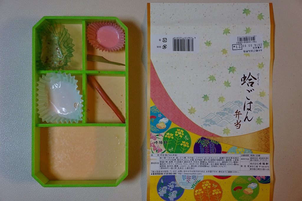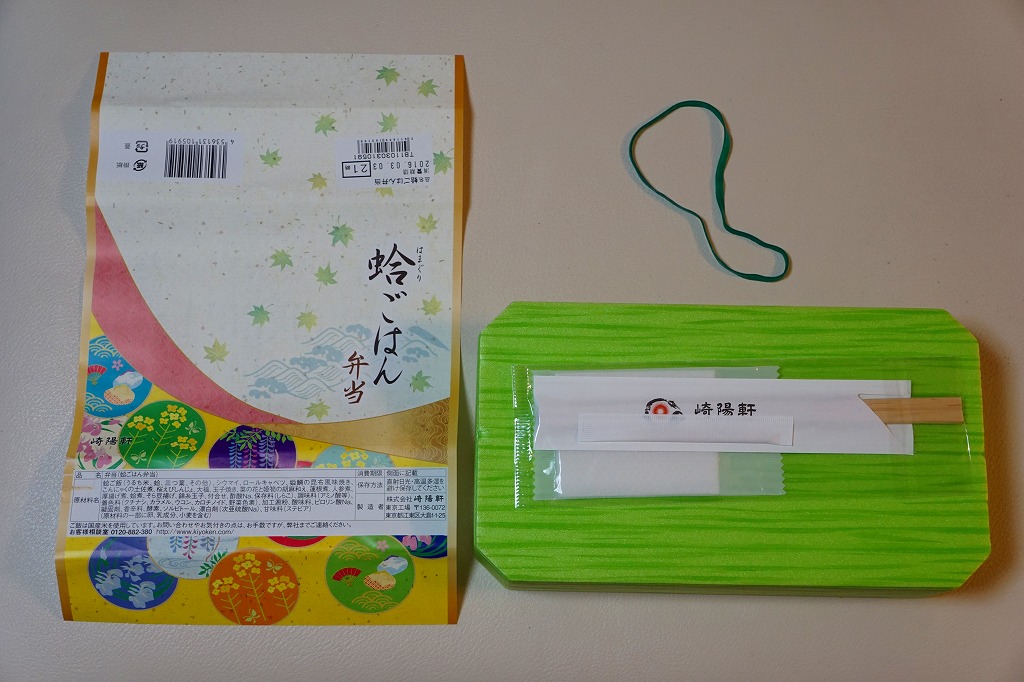 2016(平成28)年3月1日から5月8日まで、東京地区と一部横浜地区で販売。ちょっと贅沢なひとときを楽しむ「旬彩弁当シリーズ」の、下記「蟹ごはん弁当」に続く第3弾。蛍光グリーンの弁当箱に、和風でもコンセプトが読み取れない絵柄の掛紙を巻く。