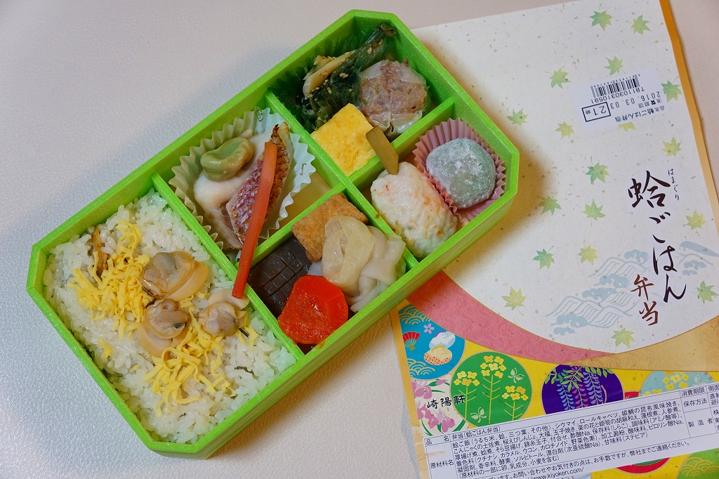 中身はハマグリ御飯、厚焼き玉子、サクラエビしんじょう、菜の花と姫筍の和え物、ヒメダイ塩焼き、ロールキャベツやニンジンなどの煮物、ソラマメ揚げ、よもぎ大福、特製シウマイ1個など。ハマグリは確かに入っているものの、ハマグリの存在感がほとんどない、淡く爽やかな味のお弁当。