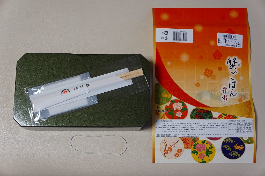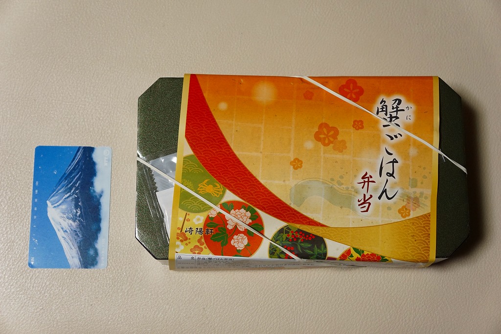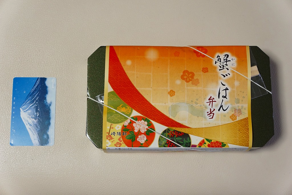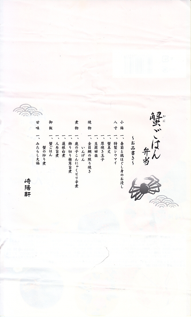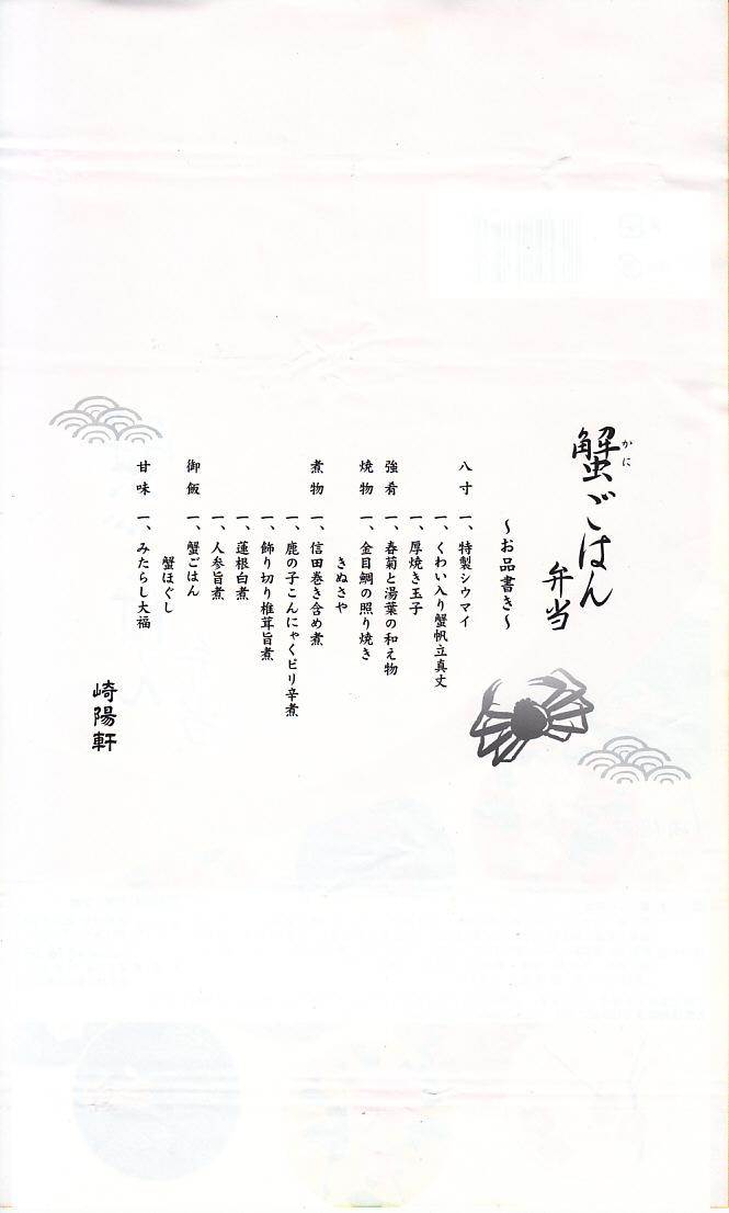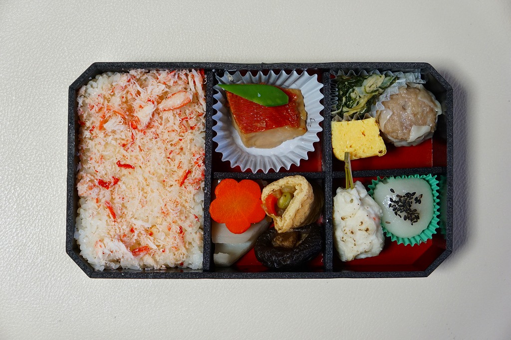 中身はカニのほぐし身を敷き詰めたカニ御飯、キンメダイ照焼、信田巻やタケノコやシイタケなどの煮物、玉子焼、ホタテしんじょう、春菊と湯葉の和え物、みたらし大福、特製シウマイ1個など。カニの駅弁といえば、カニを前面に出した、カニづくし、カニだらけのものが多いが、これは幕の内か松花堂タイプのお弁当。カニは味も香りも量もとても控えめな、普通の千円のお弁当。
