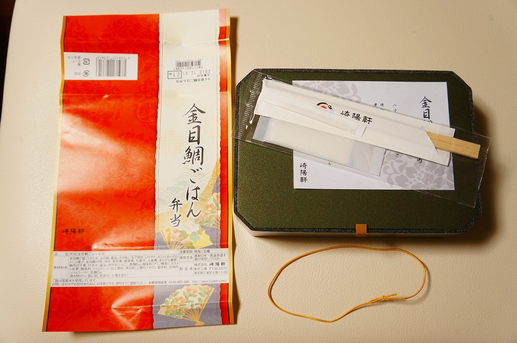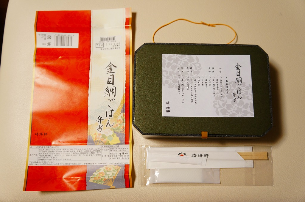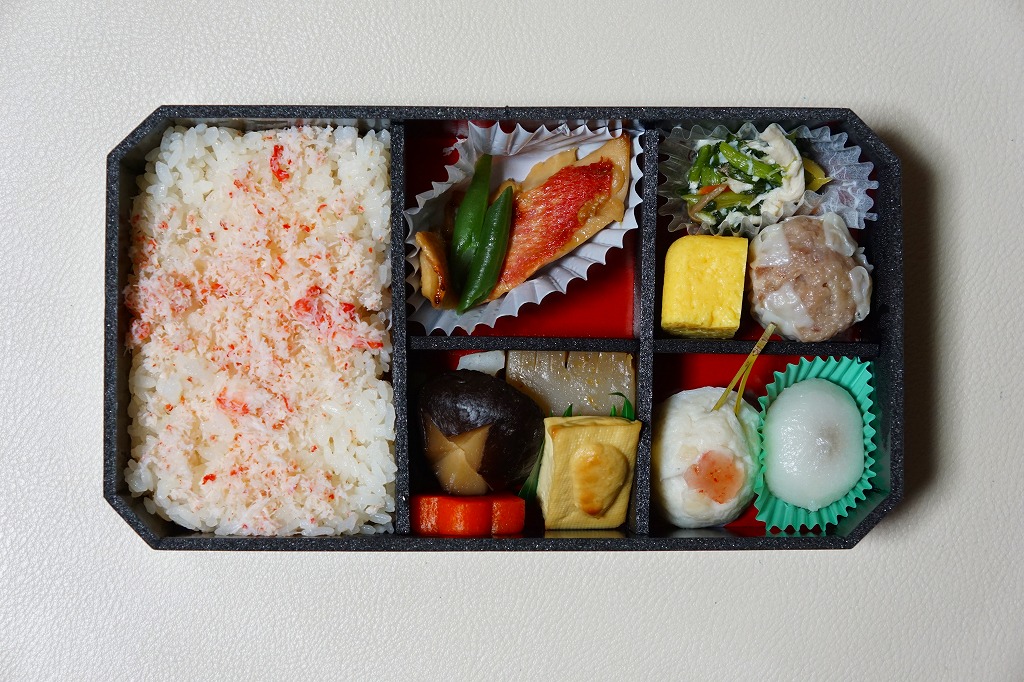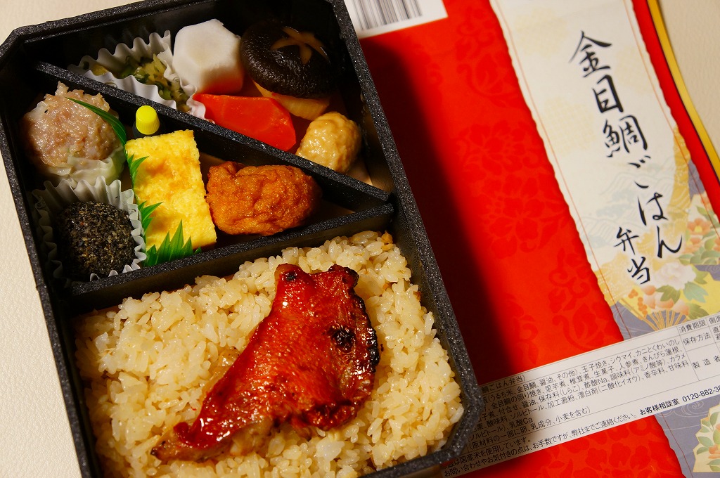 商品名を書いた赤い掛紙に包まれる、黒い長方形の容器の中身は、キンメダイの照焼を載せた炊込飯、カニしんじょう揚、玉子焼、サトイモやシイタケなどの煮物、鴨入り鶏肉団子、野沢菜漬、ごまのおはぎ、特製シウマイ1個など。味も見栄えも締まる、とても美しいお弁当。