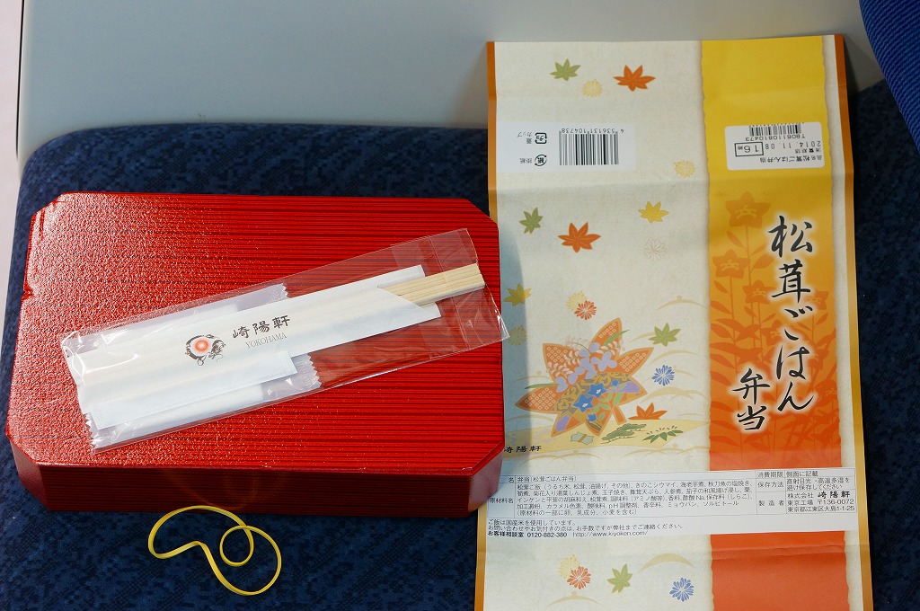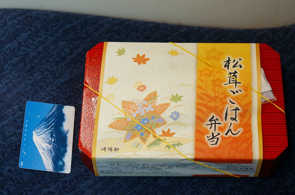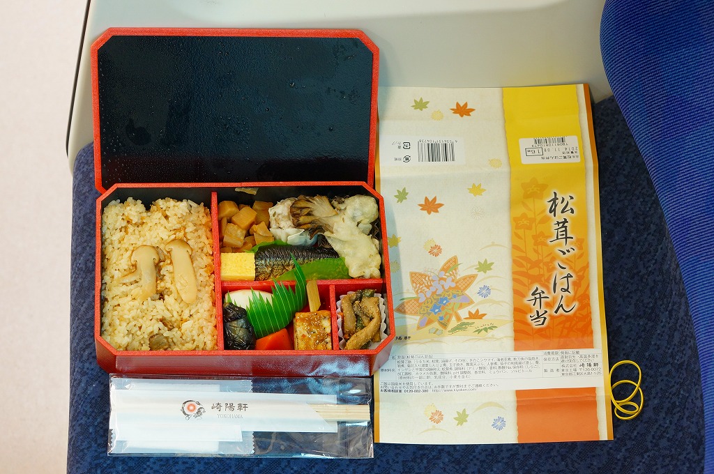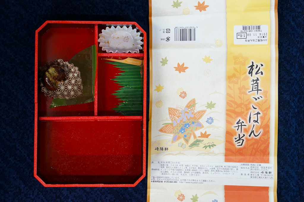 崎陽軒の東京地区の松茸弁当の2014(平成26)年版で、9月1日から11月30日までの販売。この姿になったのは2011(平成23)年からで、今回の中身は松茸御飯、サンマの麹焼き、マイタケ天、湯葉しんじょう、エビイモとニンジンとナスの煮物、玉子焼、タケノコ煮、きのこシウマイなど。マツタケの香りや分量が多くなくても、素材や調味料の様々な香りが漂う高級弁当。