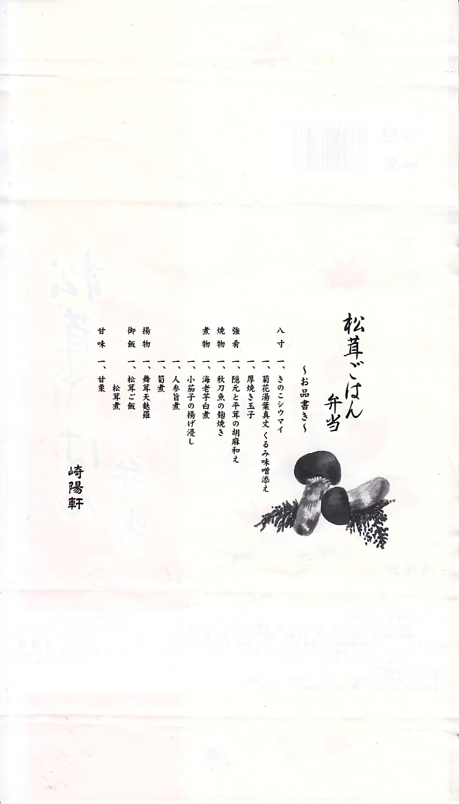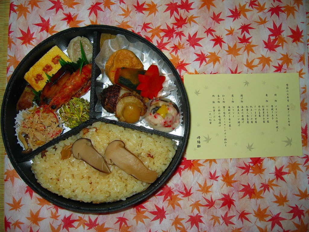 2008(平成20)年9月20日から11月30日まで東京地区で販売された崎陽軒の秋弁当。黒い円形の容器を、紅葉がいっぱいの風呂敷で包む。中身はベンツのマークのように3分割され、松茸御飯、ホタテやカボチャやニンジンなどの煮物、揚げ海老にメメカジキ照焼に厚焼き玉子に魚すり身団子やシウマイなど。デパ地下弁当の雰囲気いっぱいで、実際に都内のデパ地下でも買える。横浜エリアでの販売はなかった。