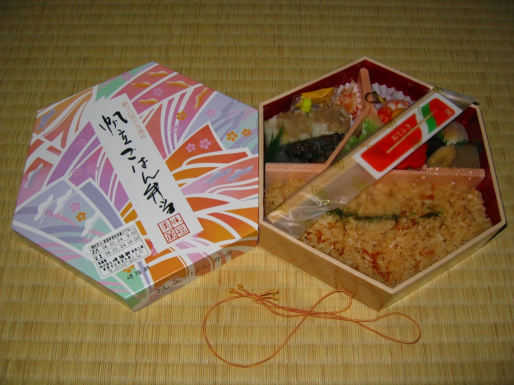 崎陽軒でも東京都内の百貨店の食品売り場にある店舗でのみの扱いだと思われる帆立弁当。正六角形の容器にボール紙のフタをかけてゴムでしばる。中身は半分が乾燥帆立貝柱の混ぜ御飯、半分がおかずでシウマイ、海老湯葉包み揚、鮭塩焼、玉子焼、煮物、ミニミニ大福など。