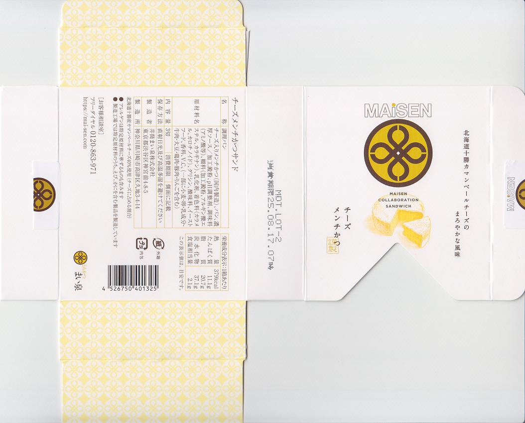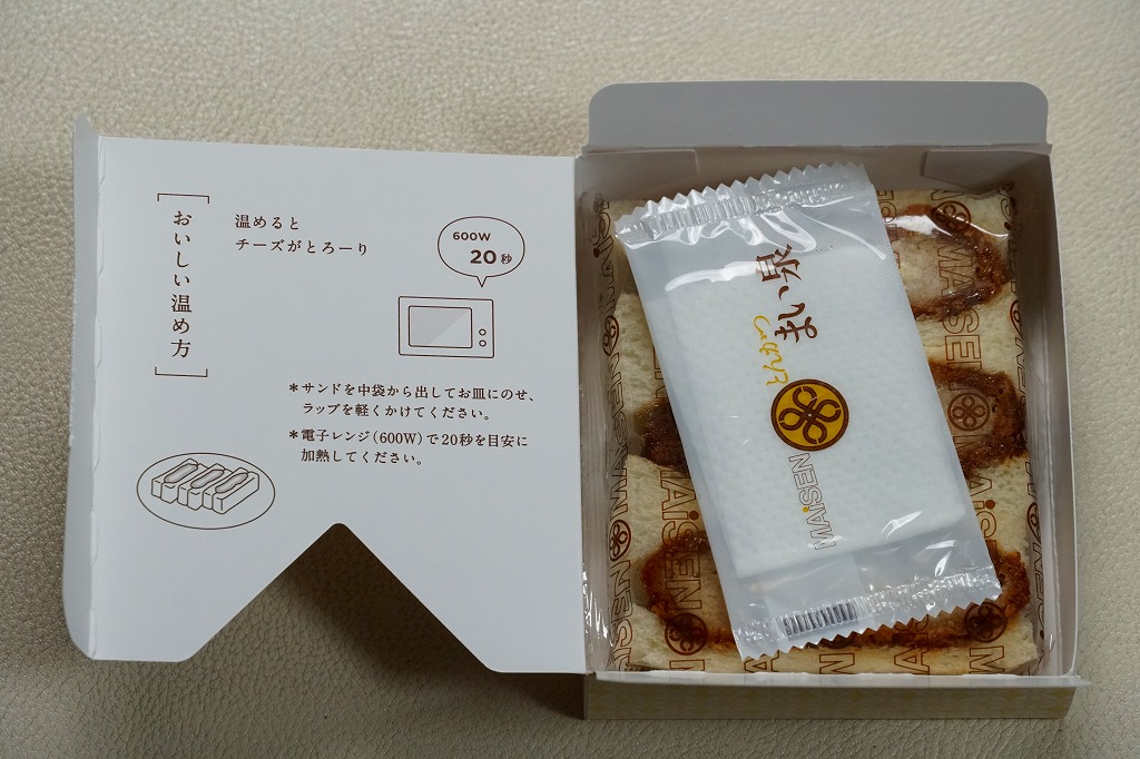 2021(令和3)年に全国で発売か。チーズ入りメンチかつを、ソースに漬けて耳なし食パンで挟んだ、とてもコンパクトなカツサンドを3切れ、専用のシートで袋詰めしたうえで、専用の紙箱に収める。北海道十勝カマンベールチーズの追加で、味がねっとり、より柔らかくなった感じ。2025年時点で駅弁売店でも買えるようになっている。