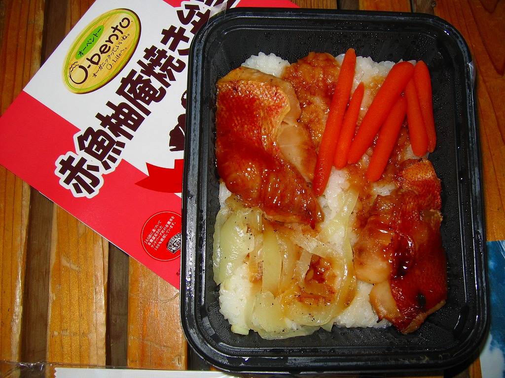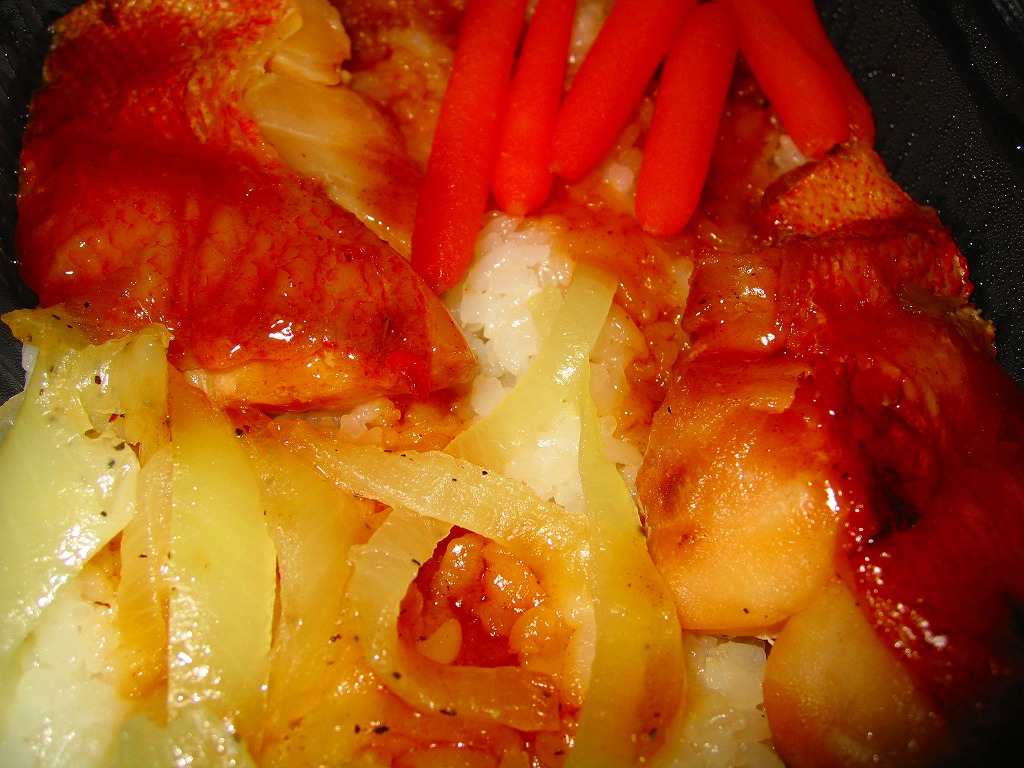 白御飯の上にタレをかけて、2切れの赤魚にニンジンとタマネギ、というかキャロットとオニオンを添える。御飯の風味は以前と同じだが焼き魚の風味は駅弁に劣らない。自宅の冷凍庫に詰めれば良い夜食になると思うが、最近は通販カタログから消えている。