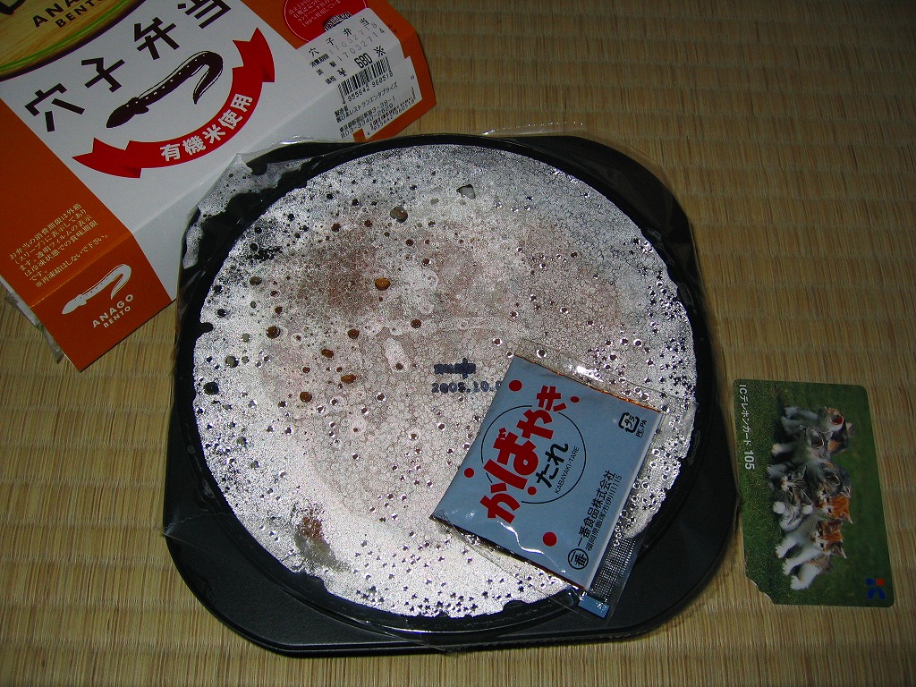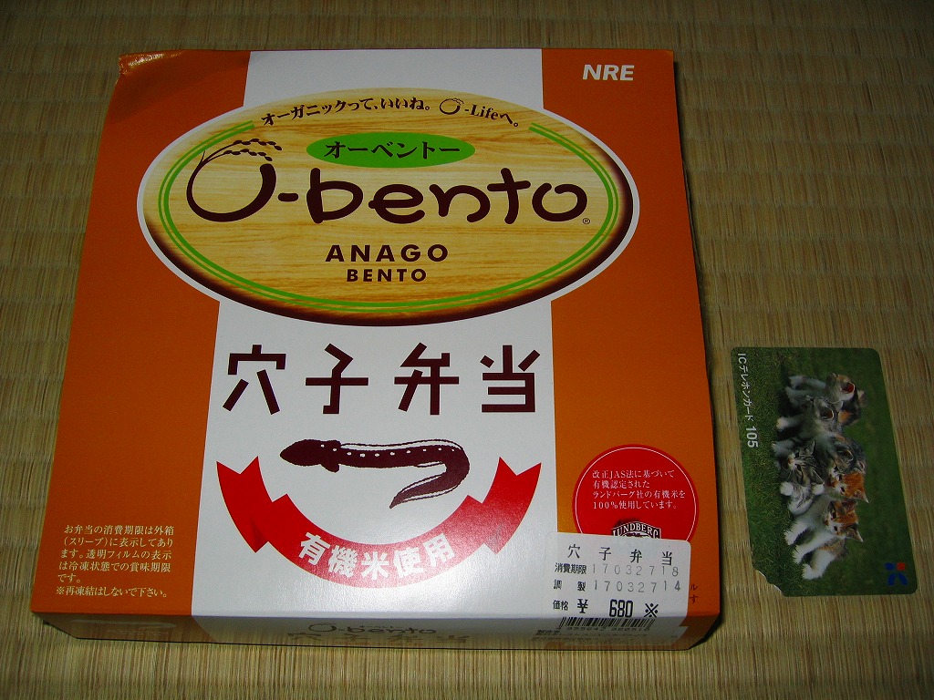 2005(平成17)年2月に発売された、O−bentoシリーズの新作。白御飯の上に、一見して不味そうなアナゴの蒲焼きを1切れ載せる。白御飯の使用で冷凍弁当のマイナス面が露骨に出て、具体的には円柱形平板の円周部が餅か煎餅のように固く硬い感じがした。穴子とタレの風味はよくできているので、もったいないと思う。O−bentoだからといって単純に批判するのは良くないと思いながら、今回同時購入の二品には落第点を。2005年7月のリニューアルで終売。