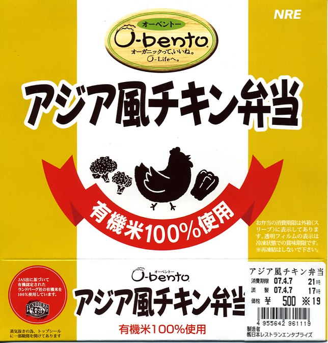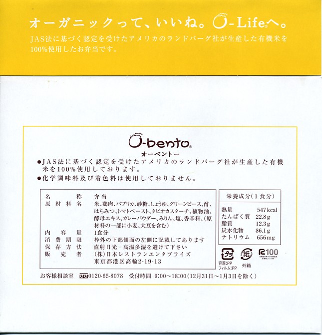 2005(平成17)年7月1日に再出発した、O−bentoシリーズの新作。アメリカ産有機米を使った、まるごと電子レンジで加熱の冷凍輸入弁当というコンセプトは変えずに、旧タイプに比べて容器がコンパクトな長方形に変わり、大680円・小390円の商品構成が500円均一となった。