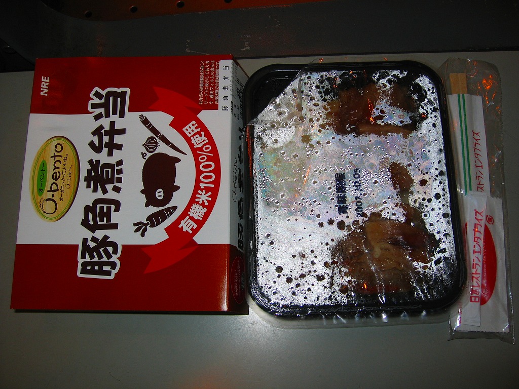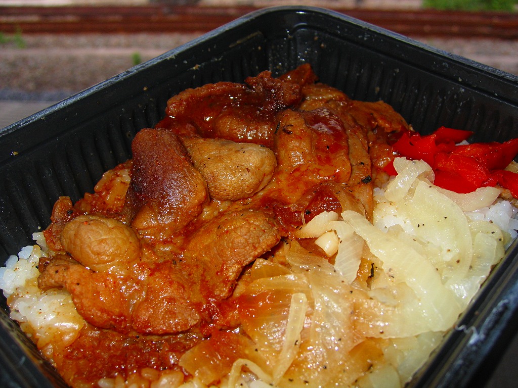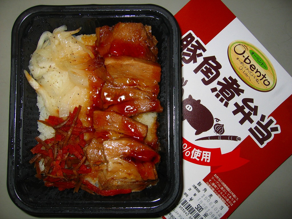 2006(平成18)年9月21日に発売された、O−bentoシリーズの新作。白御飯の上に、見た目は崩れてしまった豚角煮が半分、タマネギ炒めが1/4、ごぼうと人参の炒め物が1/4。豚肉のこういう商品なので、臭いか固いかと思ったらそうではなく、意外にいける味。少なくともこの時のO−bentoの現行品は、見栄えと食感を除けば不味いわけではなく、駅弁でない場所に生き残る道があるような気がした。しかし上記のとおり、2007年中にシリーズそのものがなくなった。