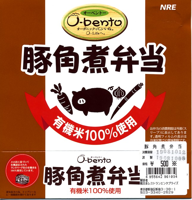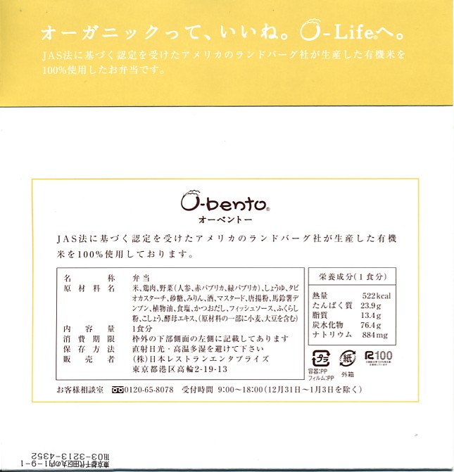 食品表示ラベルに注記が一部隠れたが、O−bentoのすべての商品には、消費期限と賞味期限で異なる日付が記される。容器の透明フィルムにある年月日は冷凍状態での賞味期限を指し、パッケージの年月日時は解凍後の消費期限を指す。2003年7月の東京都港区の保健所からの指摘を受けて、表示を明確化したもの。
