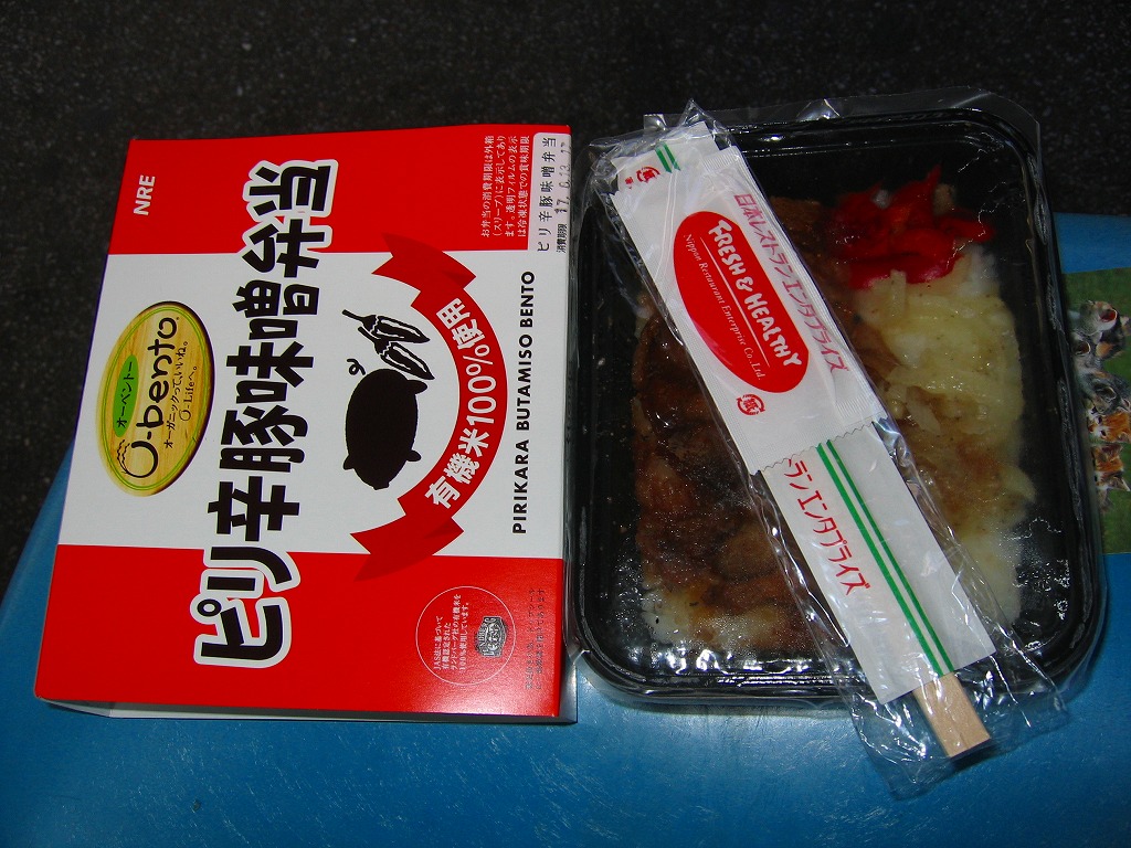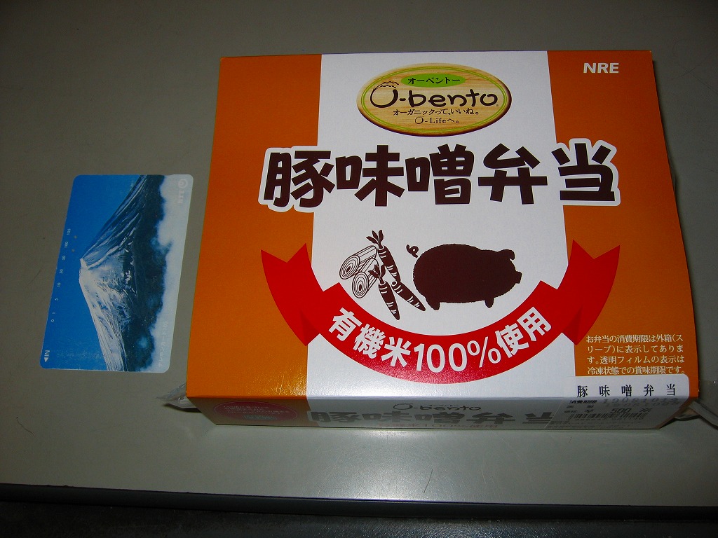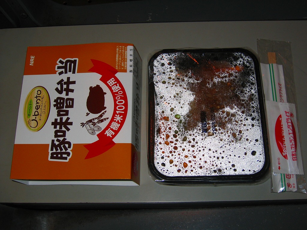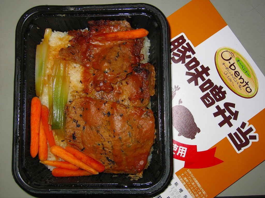発売の時期は分からないが、O−bentoシリーズ最後の新作商品か。白御飯の上に、やや乾燥気味の豚味噌焼が敷かれ、ネギとニンジンが添えられる。豚肉のサクッとした歯触りとしっかり絡まったタレは、車内や屋外での消費形態に向くもので、同じ価格帯のコンビニ弁当や惣菜弁当より美味いのではないかと思う。