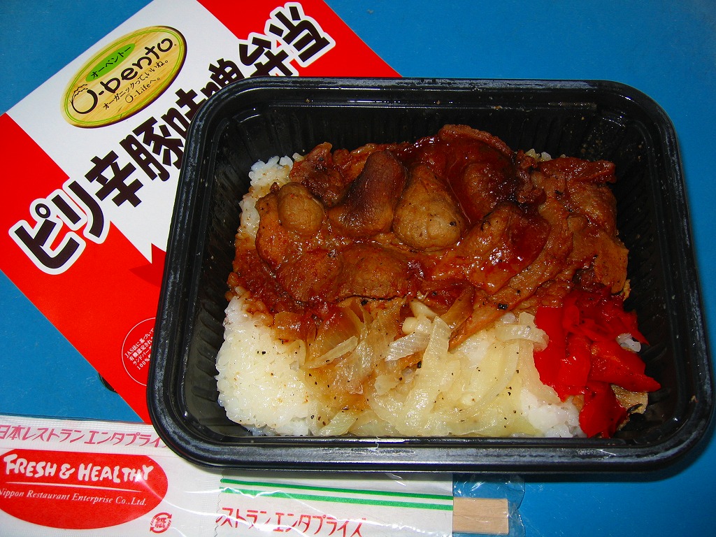 2005(平成17)年7月1日に再出発した、O−bentoシリーズの新作。白御飯の上にタマネギとパプリカと豚味噌焼を載せてコショウを振る。一般的なピリ辛のイメージより、かなり辛さを抑えているというか出せていないと思うが、これで冷凍弁当の欠点を隠すというか利点を出す味になったと思う。購入時は確実にアツアツなので、冷めないうちに消費する。ほどなく売り止めた模様。
