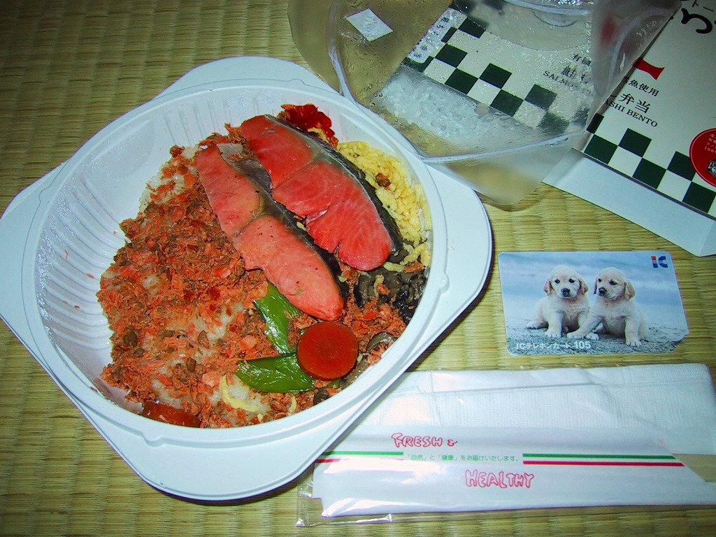 2001(平成13)年7月17日に東京駅などで全6種が発売された「O−bento(オーベントー)」シリーズのひとつ。これは鮭弁当の大きいほうで、白御飯の上にふわふわした不思議な食感の鮭が載り、鮭フレーク・人参・椎茸・絹さや・赤パプリカ・錦糸卵で御飯を覆う。発売当初は600円であったが、2002年から680円に値上げ。2005年7月のリニューアルで消滅。