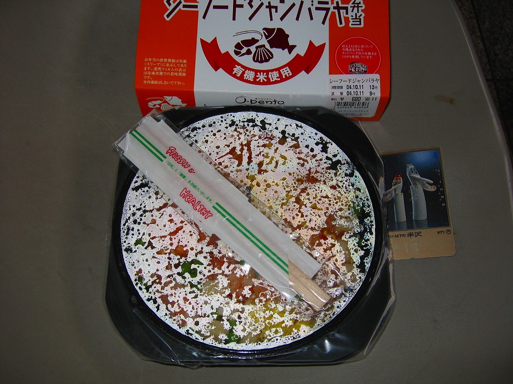 2003(平成15)年10月に発売された、O−bentoシリーズの新作。聞き慣れない料理名は、フランス料理とアメリカ南部料理が混在した「ケイジャン料理」の代表的なメニューだそうで、「チキンと魚貝のスパイシーピラフ」と副題が付いている。パッケージは他のO−bentoと同じ構造、中身はチリソース御飯の上に鶏肉や海老や椎茸や帆立貝柱がやはりスパイシーになって載るもの。刺激物は解凍弁当の味付けにピッタリだと思った。2005年7月のリニューアルで終売。