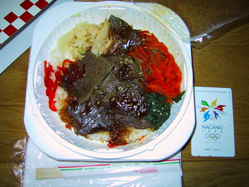 薄手のボール紙製パッケージに、フィルムで密封されたコンビニ弁当風のプラスティック製容器が入る。中身は白御飯をビーフジャーキーのような硬い牛肉と、玉葱・人参・椎茸・春雨・絹さやと赤パプリカで覆うもの。発売当初は600円であったが、2002年から680円に値上げ。この「牛すき焼き風弁当」は、2003(平成15)年12月からの米国産牛輸入停止と前後して終売の模様。