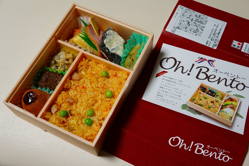 掛紙に写真とお品書きで載る中身は、カニのバターライス、銀鮭のベーコンレーズンソース、スパニッシュオムレツ、キャロットラペ、ナガイモとキノコの甘酢漬、ムール貝のサフランクリーム煮、チキンのトマトマリネ、洋ナシとイチゴのコンポートなど。味付飯に鮭塩焼や玉子焼などという駅弁を、最新の洋食に仕立てた感じ。今回も昨年と同じく、大船駅の駅弁屋の調製とは思えないような薄味の洋食だった。前年は2種が一度に出たが、今回は後にもう1種が出るそうな。