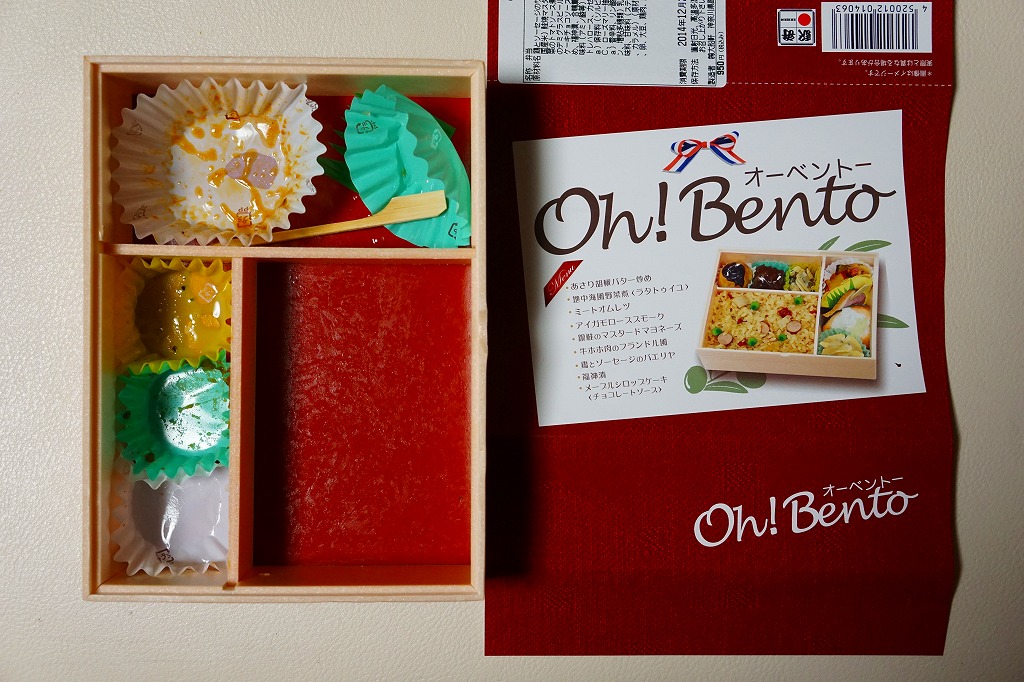 2014(平成26)年12月から翌月頃まで、東京駅で販売か。掛紙に記されたお品書きのとおり、四角い容器に鶏とソーセージのパエリアを詰め、あさり胡麻バター炒め、地中海風野菜煮、ミートオムレツ、アイガモローススモーク、銀鮭のマスタードマヨネーズ、牛ホホ肉のフランドル風、福神漬、メープルシロップケーキを添える。