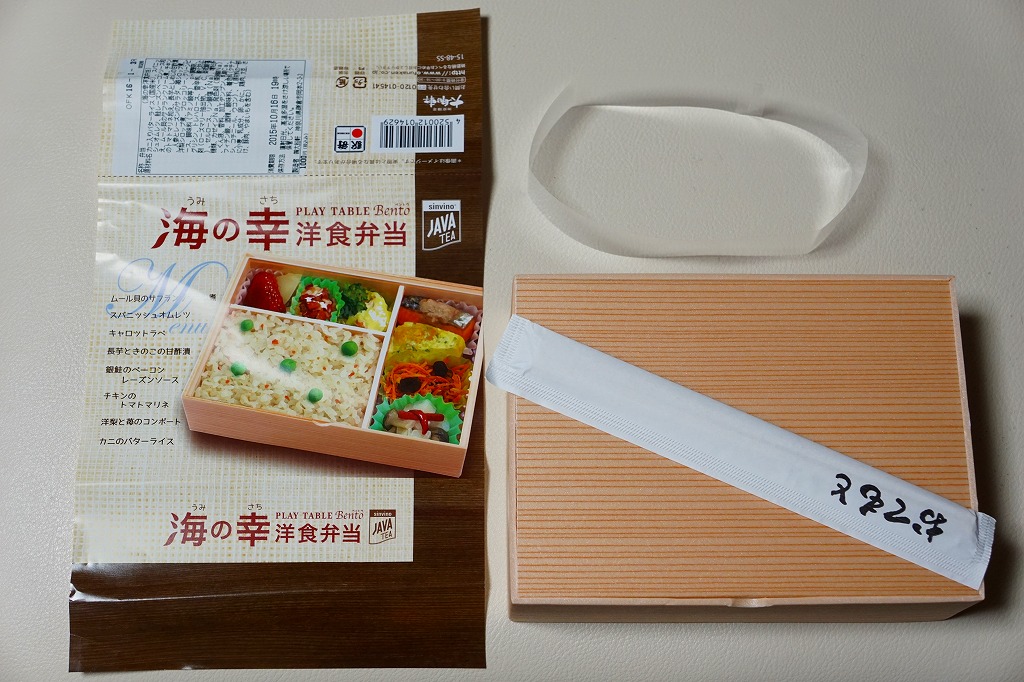 大塚食品と日本レストランエンタプライズ(NRE)と大船軒とのコラボレーション駅弁「PLAY TABLE Bento」の一種で、2016(平成28)年1月から3月までの販売か。以下の第2弾「海の幸洋食弁当」の発売発表時に、もう1種類の発売が予告されていたものの実物で、第2弾の第4種類目といえるだろうか。容器や意匠と、「シンビーノ ジャワティストレート」500mlペットボトルの赤または白が1本付いてくることは同じ。