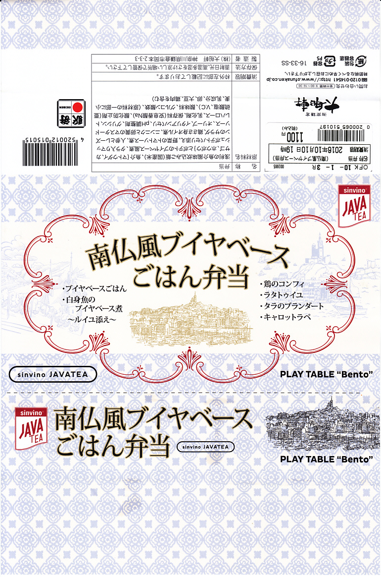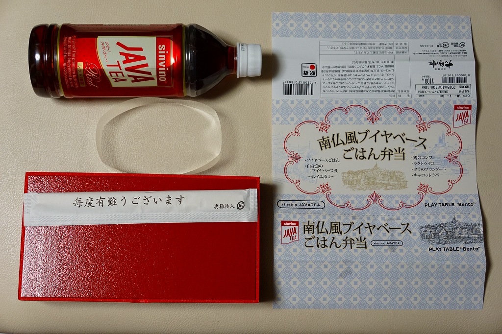 赤い容器の左半分にブイヤベースごはん、右半分に白身魚のブイヤベース煮、鶏のコンフィ、ラタトゥイユ、タラのブランダート、キャロットラペ。聞き慣れない品々が掛紙に記される、淡い魚介類の香りと味がする貝飯と白身魚など。引き続き「JAVATEA」の白か赤の500mlペットボトルを1本添付。買い手を選ぶと思う、他の駅弁にない個性的な中身と味だった。ブイヤベースとは南フランスの郷土料理で、白身魚などの魚介類と野菜などの煮込み料理。