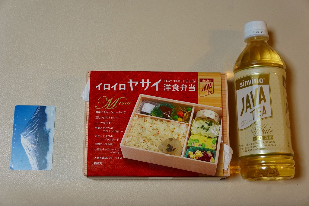 2017(平成29)年9月21日の発売。大塚食品と日本レストランエンタプライズ(NRE)のコラボレーション駅弁「PLAY TABLE Bento」の、2014年からの4年目の、「南仏風」「台湾風」「ジャマイカ風」に続く第4弾。JAVATEAの白か赤の500mlペットボトルが1本ついてくるのは従前どおり。掛紙はお品書きと食材のイラストを描いたターメリック色。