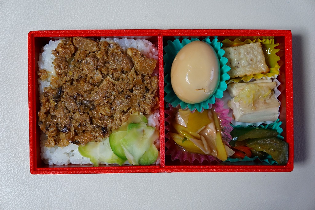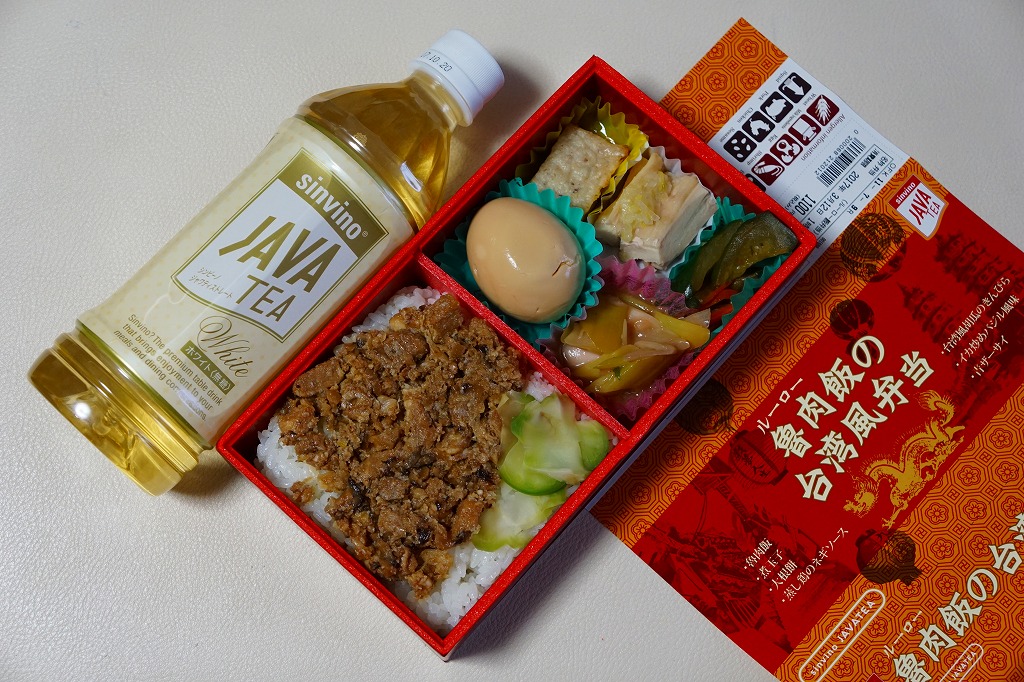 中身は「魯肉飯」(ルーローファン)「煮玉子」「大根餅」「蒸し鶏のネギソース」「台湾風胡瓜のきんぴら」「イカ炒めバジル風味」「青ザーサイ」と書いてある。白御飯を豚バラ煮込みそぼろで覆い、ザーサイを添え、残りのおかずを右側に詰める。その名のとおり台湾の香り、あるいは臭みがとても豊かだった。これと味が同じ駅弁が、半年後に大船駅で出ている。