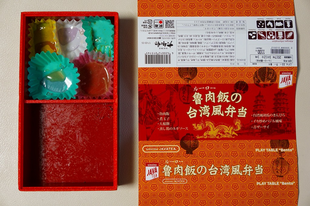 2017(平成29)年1月下旬から3月までの販売か。大塚食品と日本レストランエンタプライズ(NRE)のコラボレーション駅弁「PLAY TABLE Bento」の、2014年からの4年目の、「南仏風」に続く第2弾。JAVATEAの白か赤の500mlペットボトルが1本ついてくるのは従前どおり。掛紙は台湾の観光名所である龍虎塔と九[イ分]の風景をシルエットにした赤と黄色のデザイン。