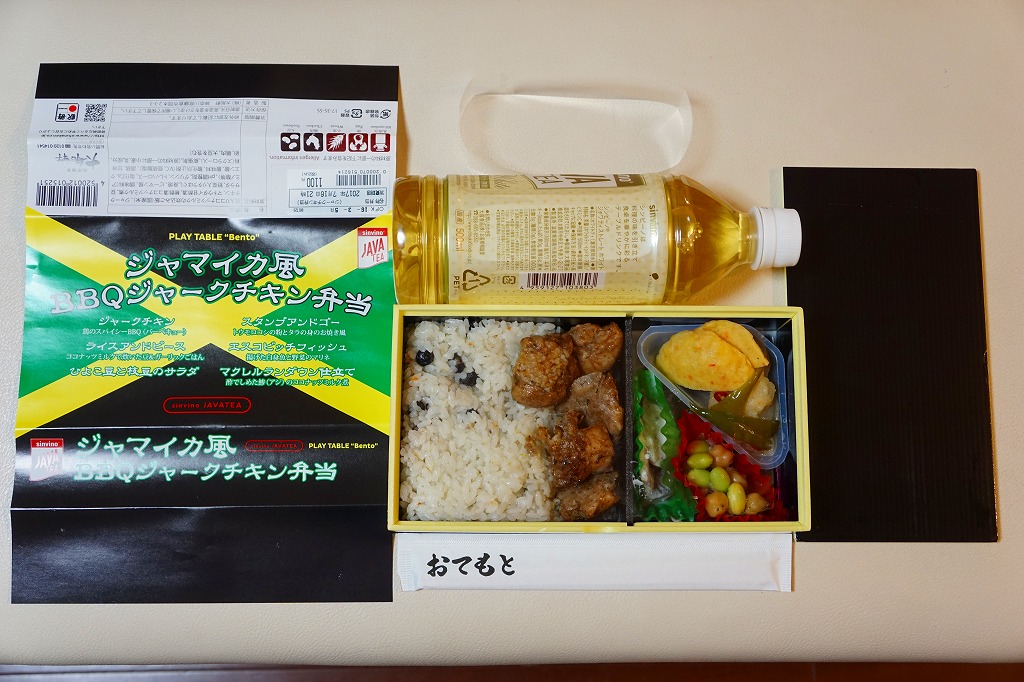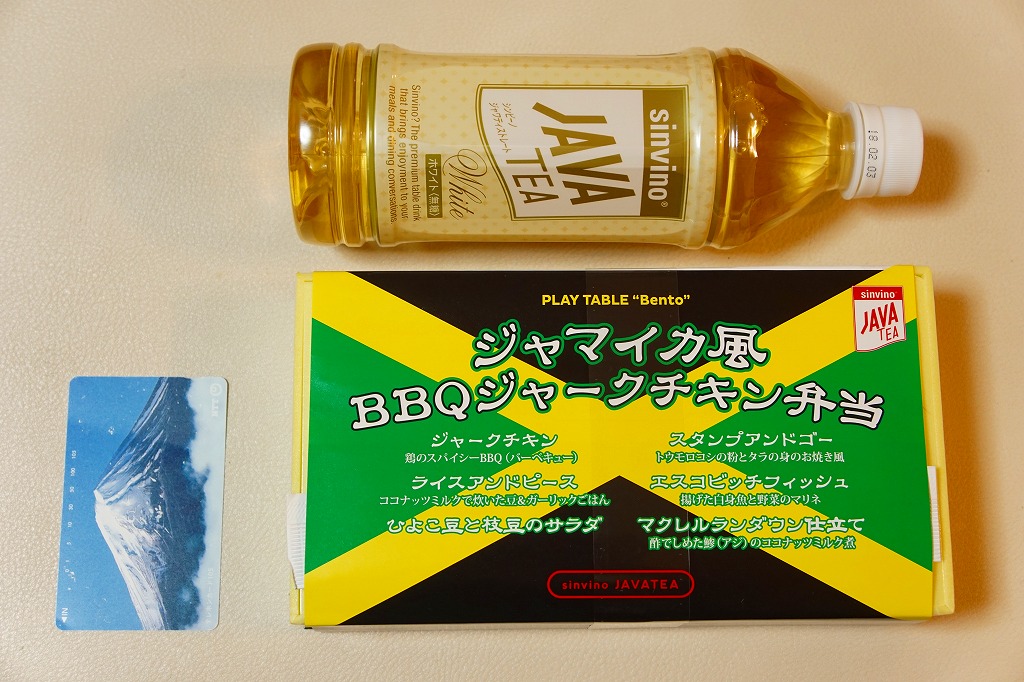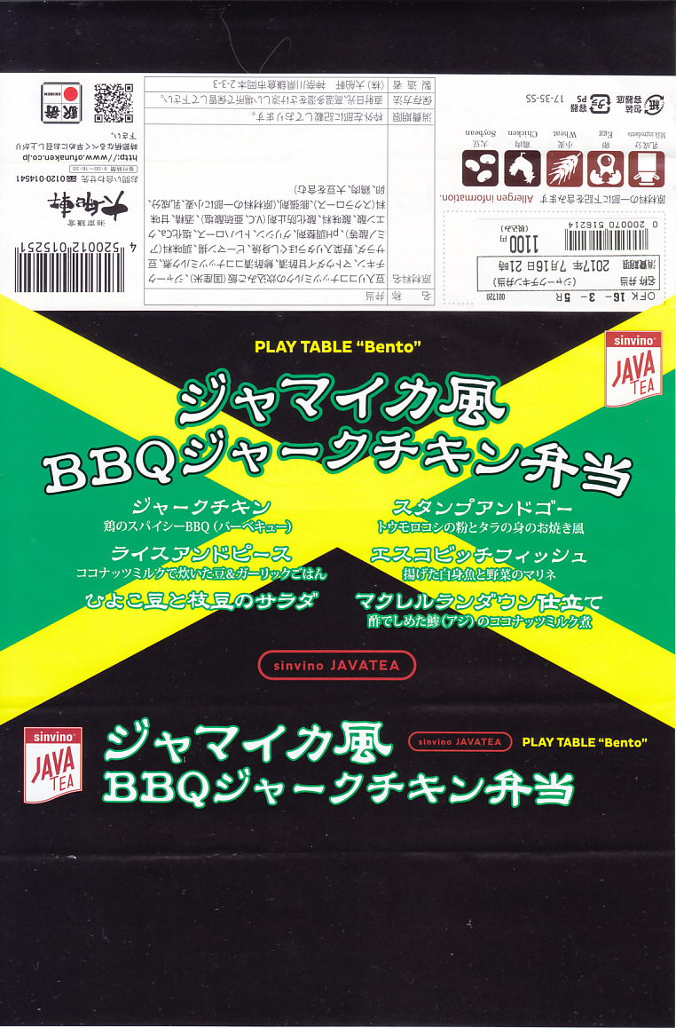 2017(平成29)年7月1日から12,000個を販売。大塚食品と日本レストランエンタプライズ(NRE)のコラボレーション駅弁「PLAY TABLE Bento」の、2014年からの4年目の、「南仏風」「台湾風」に続く第3弾。JAVATEAの白か赤の500mlペットボトルが1本ついてくるのは従前どおり。掛紙はジャマイカの国旗に、お品書きを書いたデザイン。