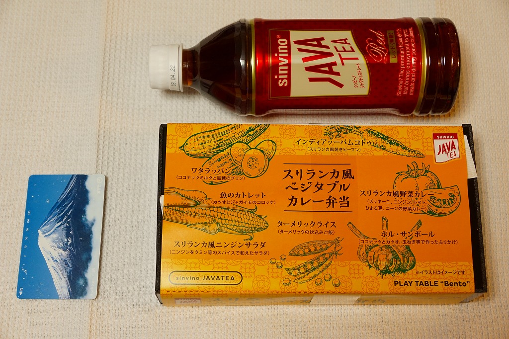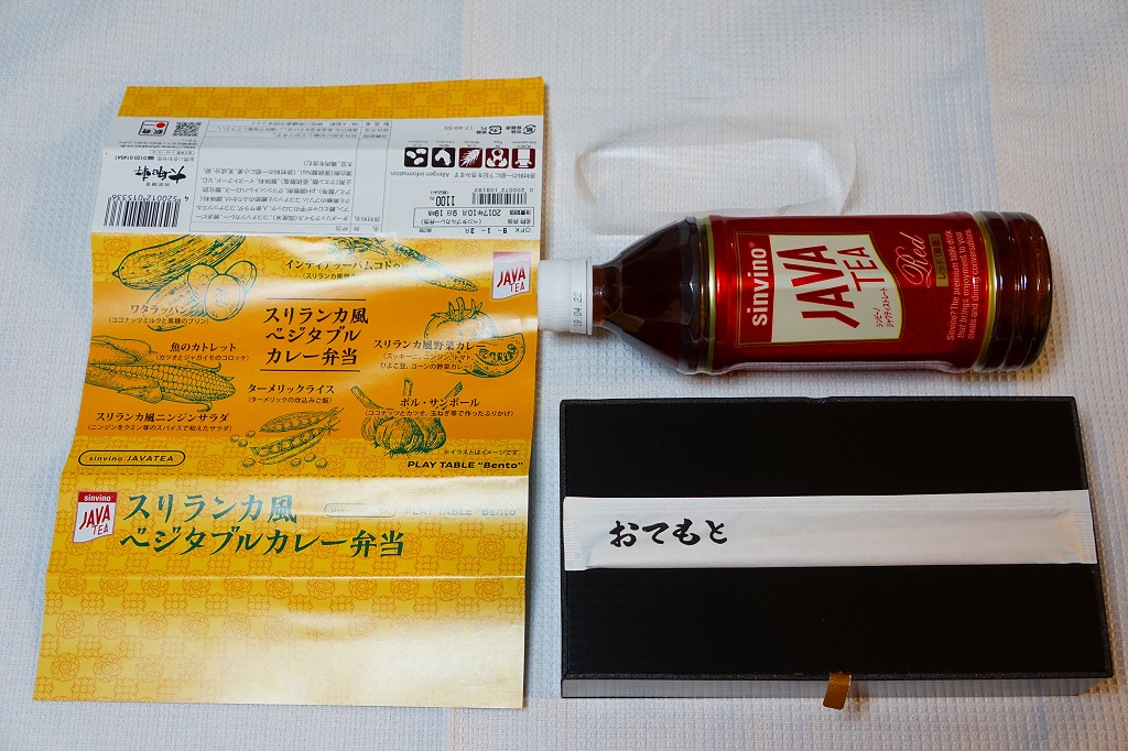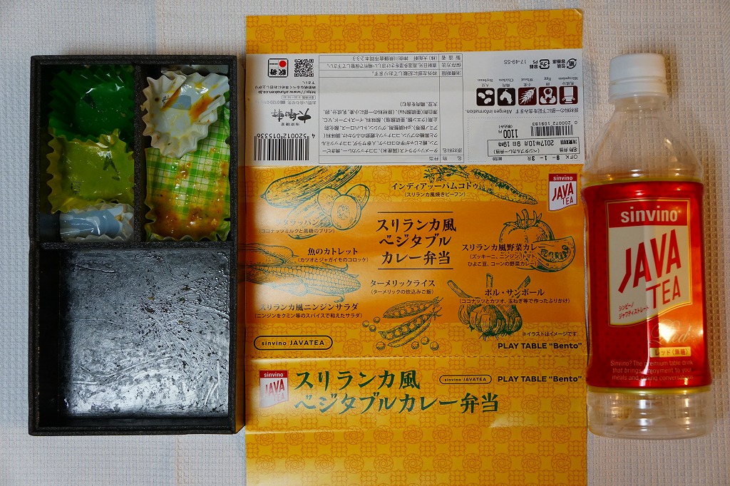 中身は「ターメリックライス(ターメリックの炊込みご飯)」「ポル・サンボール(ココナッツとカツオ、玉ねぎ等で作ったふりかけ)」「スリランカ風野菜カレー(ズッキーニ、ニンジン、トマト、ひよこ豆、コーンの野菜カレー)」「インディアッーパムコトゥ(スリランカ風焼きビーフン)」「魚のカトレット(カツオとジャガイモのコロッケ)」「スリランカ風ニンジンサラダ(ニンジンをクミン等のスパイスで和えたサラダ)」「ワタラッパン(ココナッツミルクと黒糖のプリン」とのこと。相変わらず、駅弁では珍しいエスニックな香りまたは臭いが漂う。