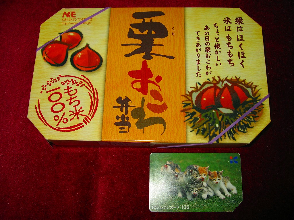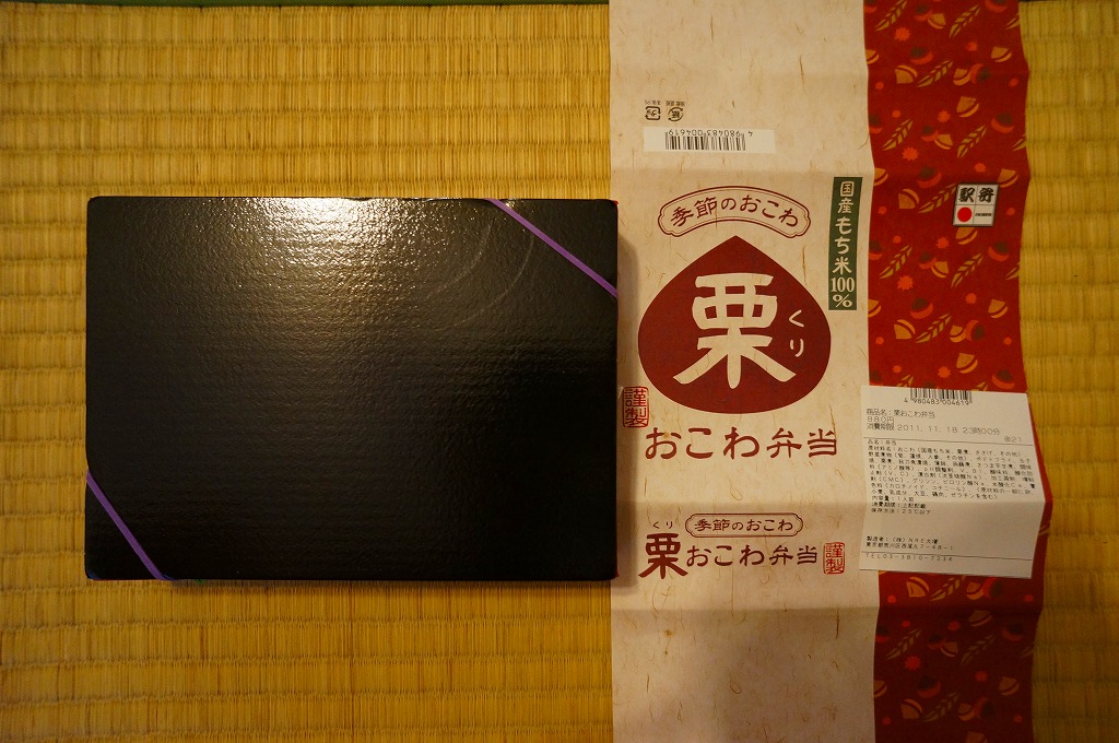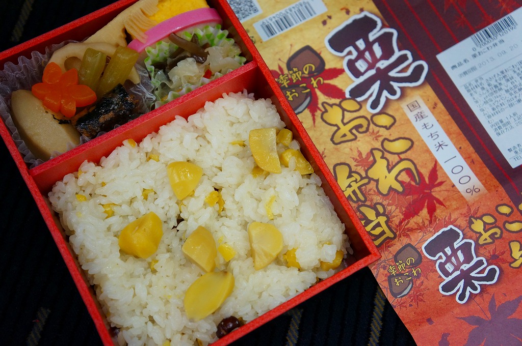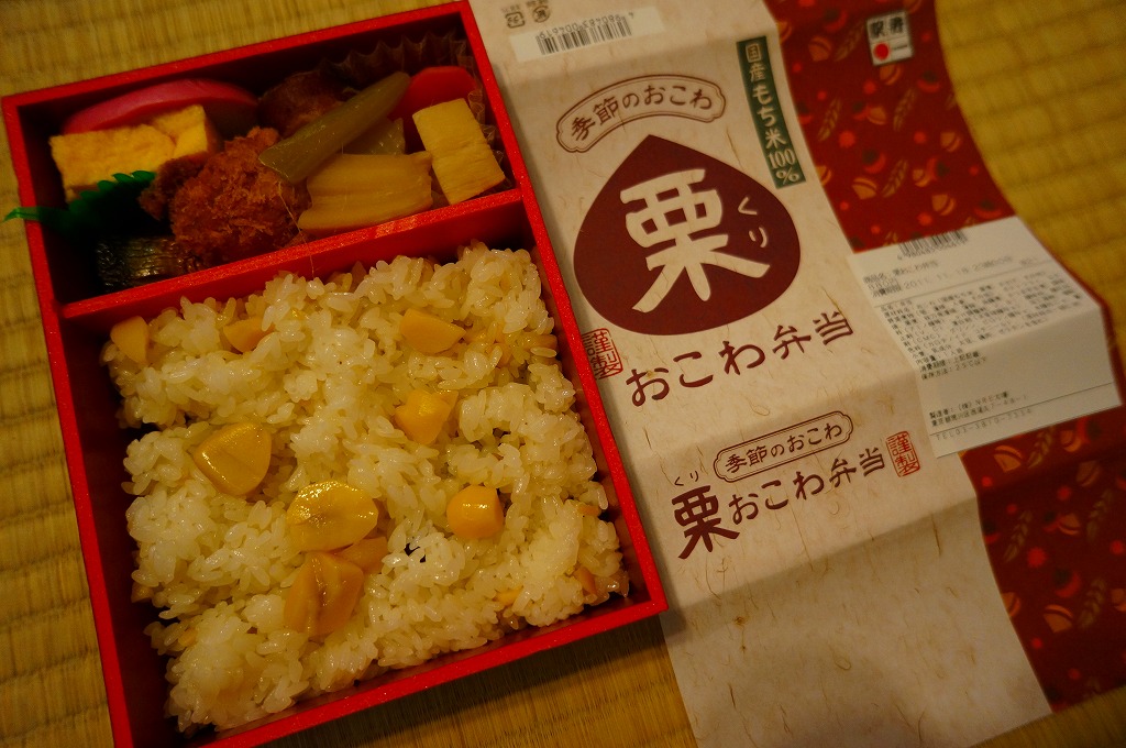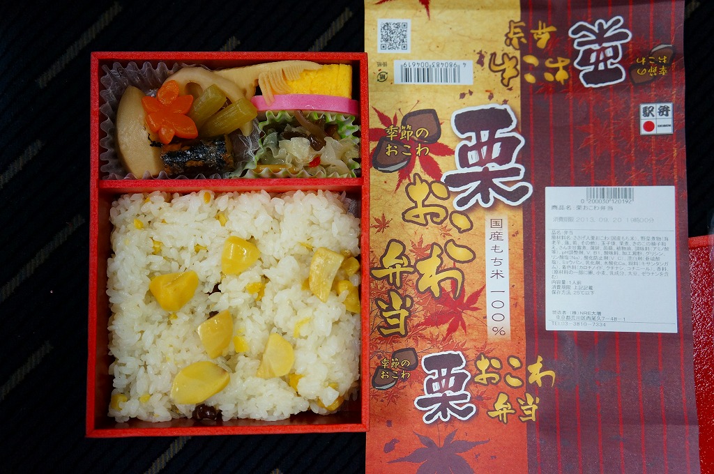 NREの首都圏エリアの、季節のおこわ弁当の2011年の秋バージョン。2010年の「たけのこおこわ弁当」と同じく、下記の2008年版と比べて大きくリニューアル。黒塗りの赤い容器を使用、栗という文字が大きく目立つ栗色の掛紙を巻く。中身はクリの破片がたっぷり入った栗おこわに、タケノコやレンコンやサツマイモなどの煮物、ポテトフライ、玉子焼、かまぼこ、サンマ漬焼など。