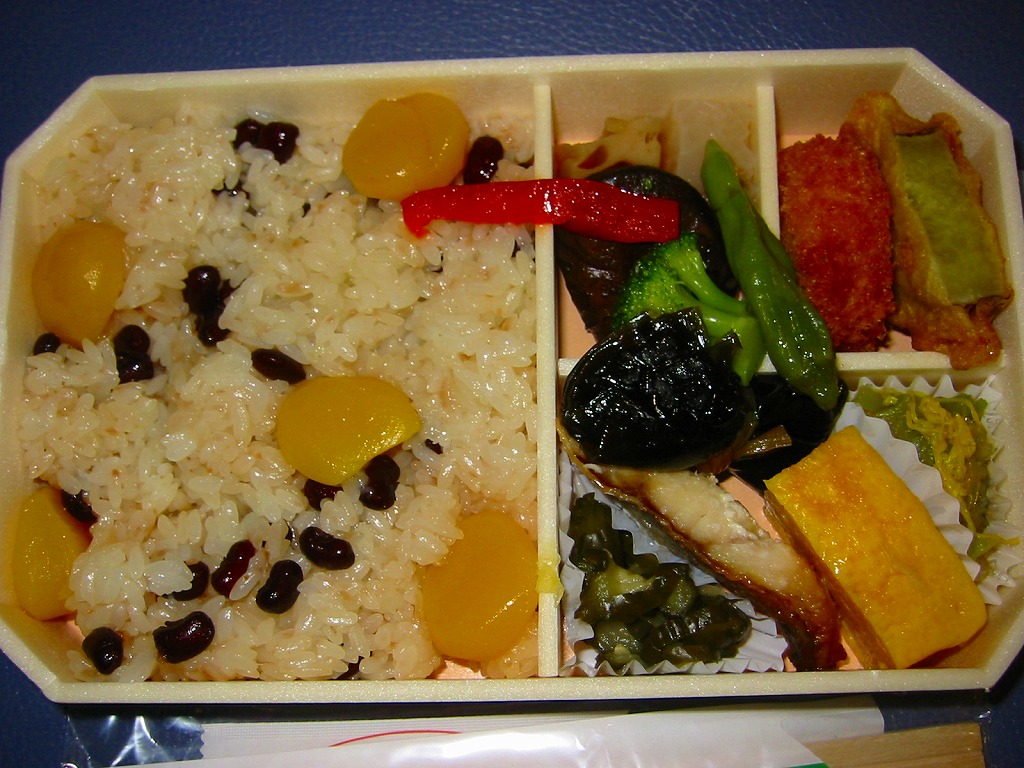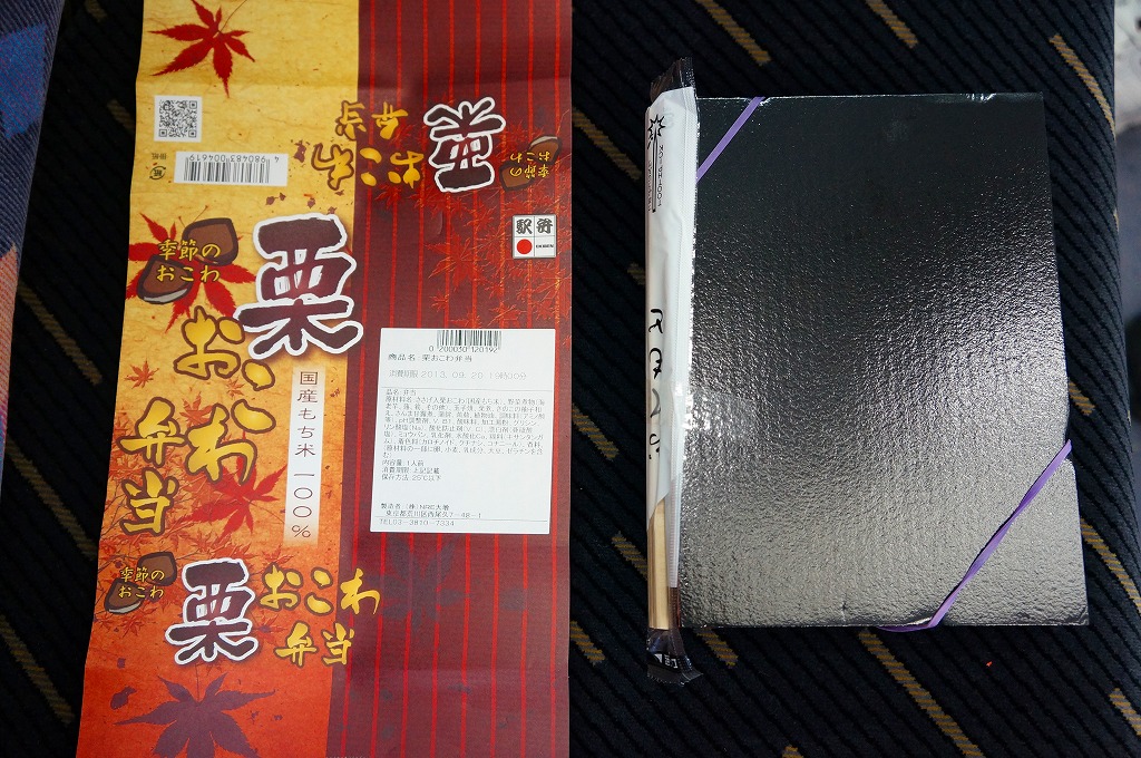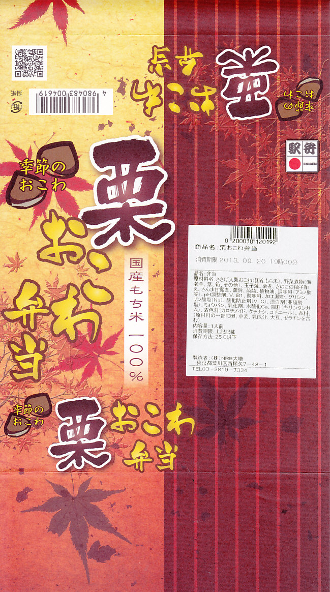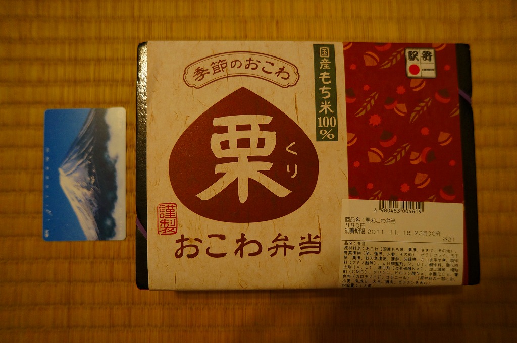 NREの首都圏エリアの、季節のおこわ弁当の2011年の秋バージョン。2010年の「たけのこおこわ弁当」と同じく、下記の2008年版と比べて大きくリニューアル。黒塗りの赤い容器を使用、栗という文字が大きく目立つ栗色の掛紙を巻く。中身はクリの破片がたっぷり入った栗おこわに、タケノコやレンコンやサツマイモなどの煮物、ポテトフライ、玉子焼、かまぼこ、サンマ漬焼など。