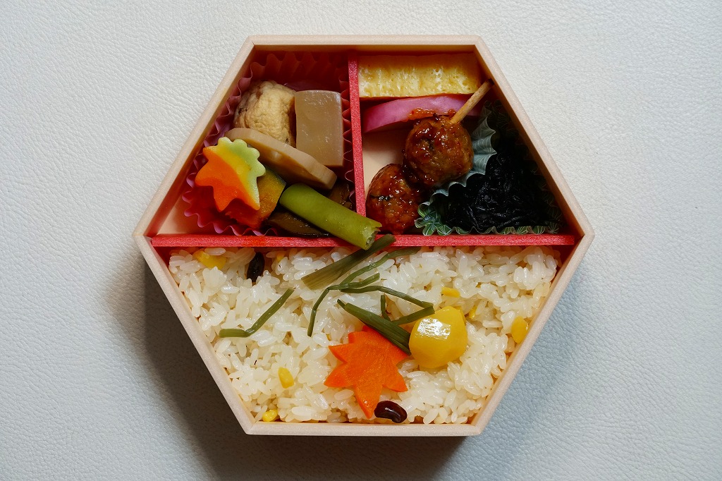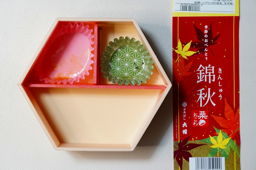 2021(令和3)年9月1日に東京、品川、新宿、上野、八王子、大宮の各駅で発売。20年以上続いた季節の駅弁「栗おこわ弁当」に代わり、9月から11月まで東京で売られる、駅やデパ地下のお弁当。正六角形の容器を3つに仕切り、半分に黒豆やニンジンなどで彩るささげ入栗おこわを、残りの半分にカボチャやこんにゃくやがんもなどの煮物を、残りに蒲鉾と玉子焼と鶏つくねとひじき煮を詰める。分量と構成と品質が確保された、東京では貴重な、1,000円でお釣りが来る駅弁。