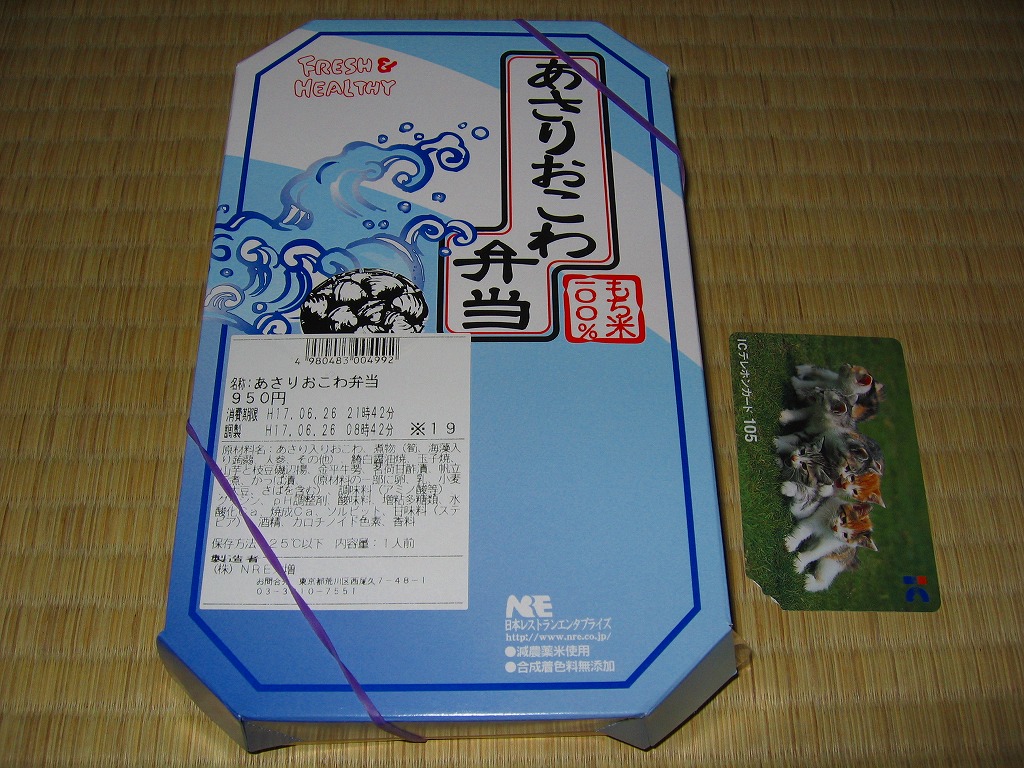下記の駅弁「あさりおこわ」の2005年版で、6月中旬から9月中旬までの季節販売。2001年のものと比較して形状や中身にほとんど変化はないが、今回は品質が格段に向上した感じで、主役のあさりおこわにアサリの風味と適度な柔らかさを感じたし、容器内の空間も偏りがない。デジカメの性能も向上したので、写真の見栄えも良い。