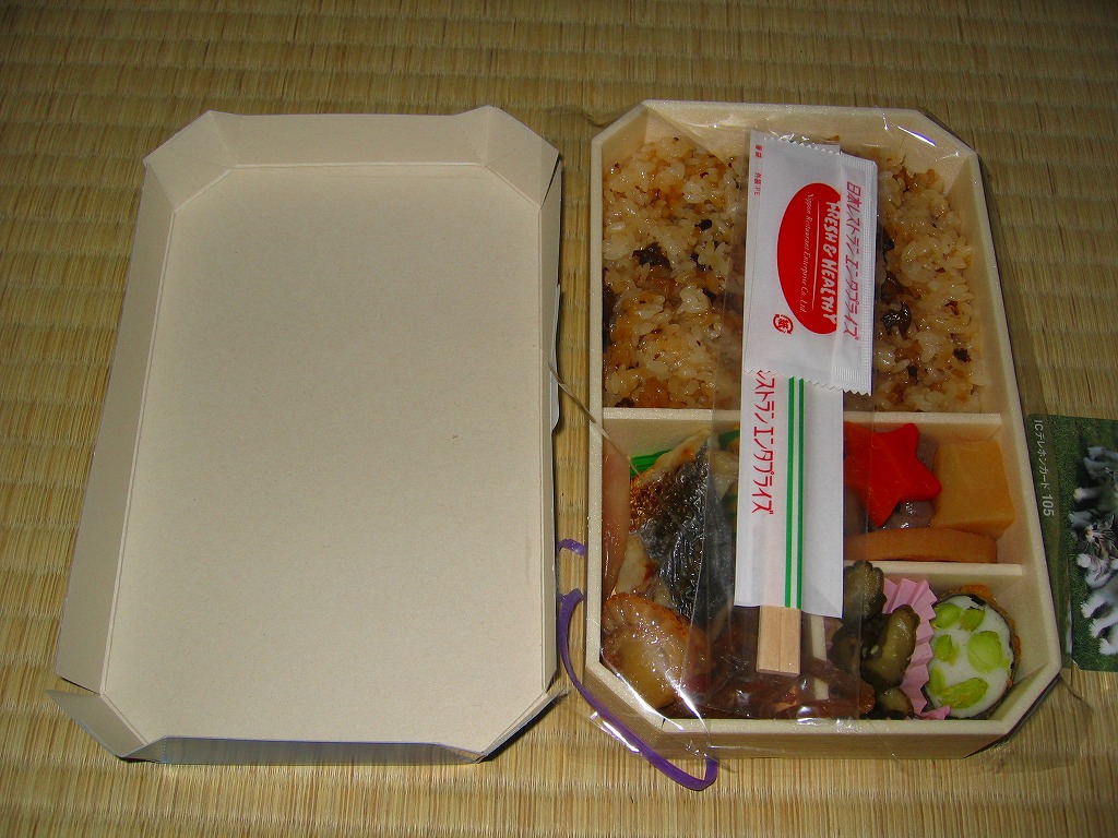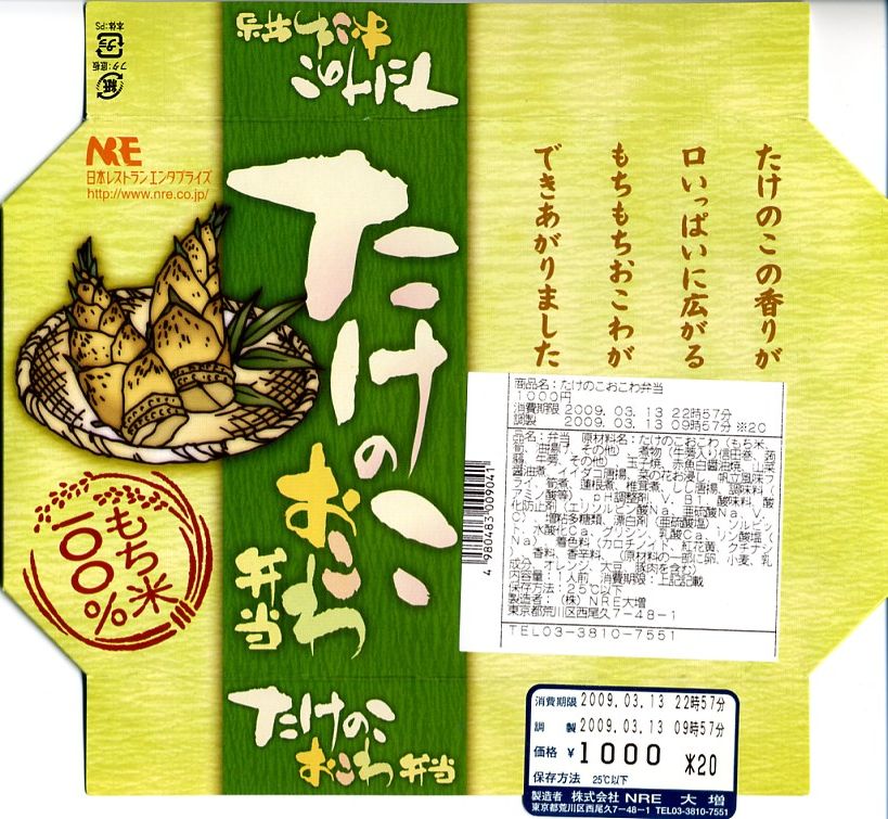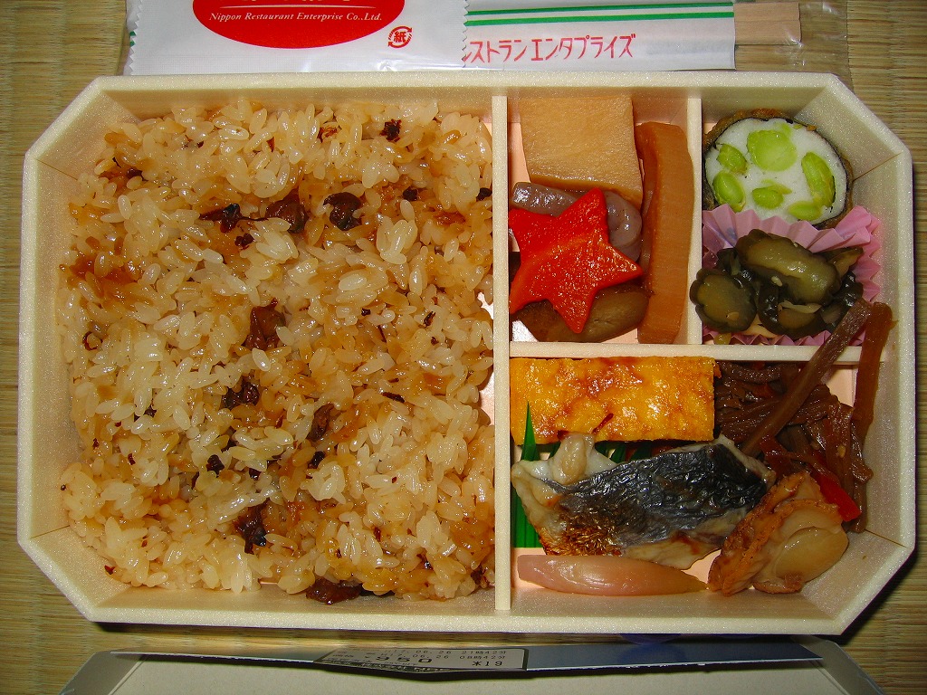 NREの季節のおこわ弁当の、2008(平成20)年の秋バージョン。角を落とした長方形の容器に、栗を描いたボール紙のふたをかける。中身は栗片がごろごろ入るおこわと、肉詰めシイタケなどの煮物、ホキ揚げ浸し、ししとう、イカすり身揚げ、合鴨ロース、玉子焼、なめこなど。下記の2003年のものと違い、常温なのにもちっと柔らかいおこわに、大きさと分量と色彩と見栄えが整ったおかずをきれいに詰めた、都会でおいしい機能的な秋の味。千円の栗飯という値段を考えると、もうひとつなにか欲しくなるが。