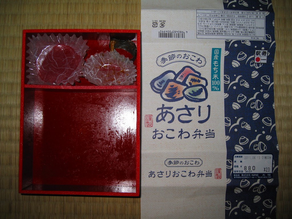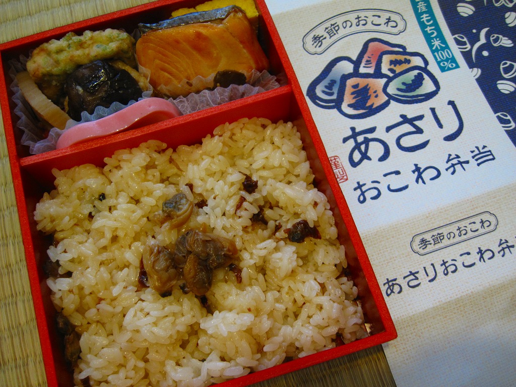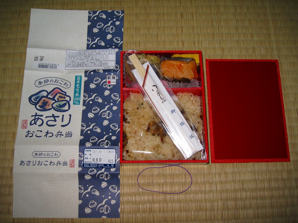 NREの首都圏エリアの、季節のおこわ弁当の2011年の夏バージョン。春と同じ容器と価格で、中身はあさりおこわに鮭塩焼、シイタケ肉詰、玉子焼、かまぼこ、豆腐の磯部揚などを添えるもの。引き続き東京駅弁としては安価なのにやわらかくおいしい駅弁であり、今回は豆腐磯部揚煮と椎茸肉詰煮の食感が高級な感じ。