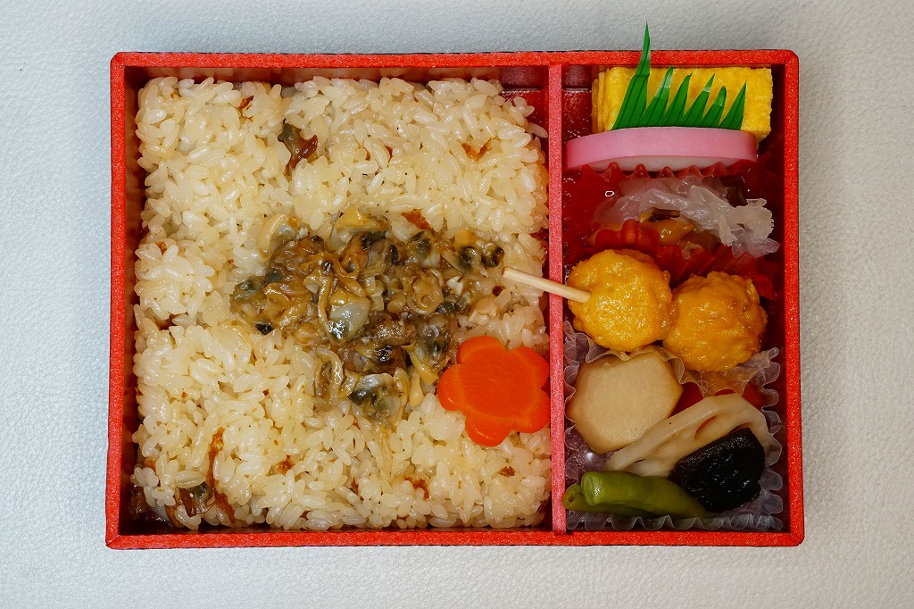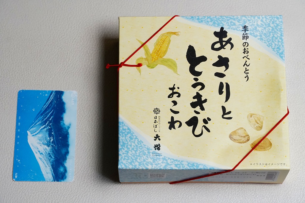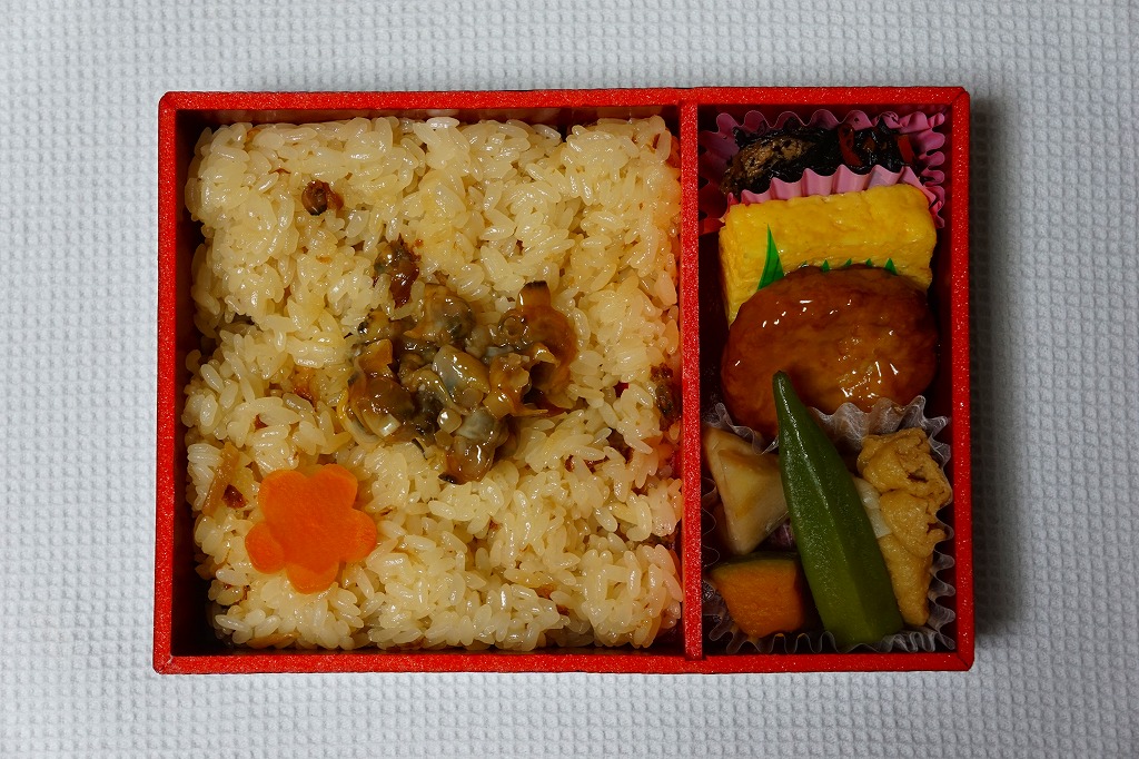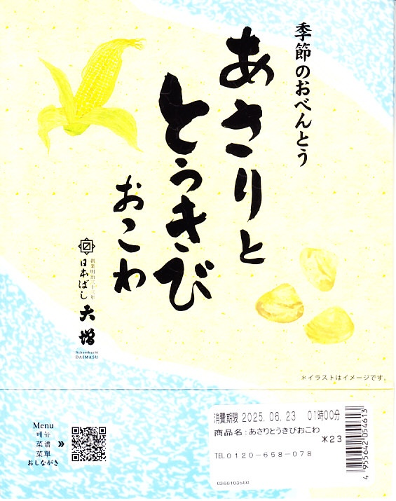 従前の夏季駅弁「季節のおべんとう涼(りょう)」を、2025年6月にリニューアル。正六角形の容器を正方形に変え、商品名を抽象から中身に変え、引き続き東京駅弁というよりは「日本ばし大増」ブランドの仕出し弁当かデパ地下弁当の姿をする。中身はトウモロコシを炊き込んだおこわに、あさりと生姜の味噌煮、花にんじん、枝豆、ヤングコーンを載せ、鶏つくね串、なすとこんにゃくとがんもとれんこんといんげんとにんじんの煮物、玉子焼、かまぼこ、切昆布煮を添えるもの。2000年頃から長らく売られたあさりおこわ弁当が、4年ぶりに帰ってきたと思ったら、これはとうきびおこわにあさりを載せたものだった。この物価高の中で、千円を切る価格が維持された。安心感と実用的な腹六分目は、下記の春版と同じ感じ。