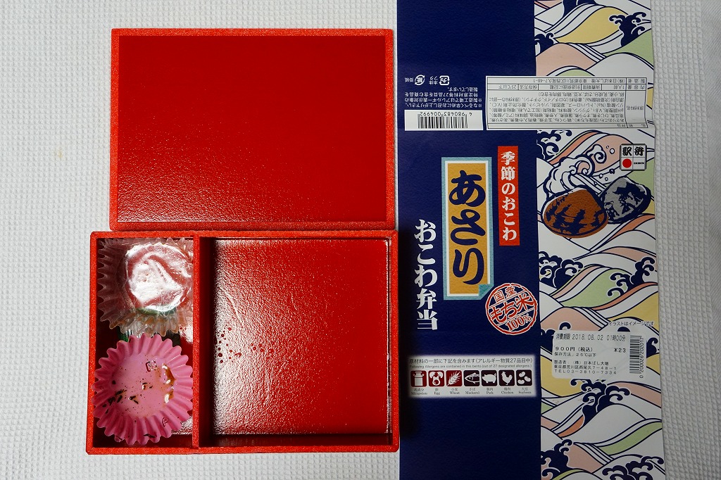 東京エリアの季節のおこわ駅弁の、2018(平成30)年の夏バージョン。あさりおこわ、玉子焼、鶏つくね、カボチャやオクラなどの煮物が入っていた。掛紙の絵柄も中身も、上記の2年後とあまり変わらない。