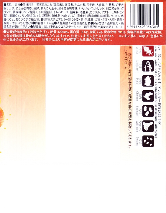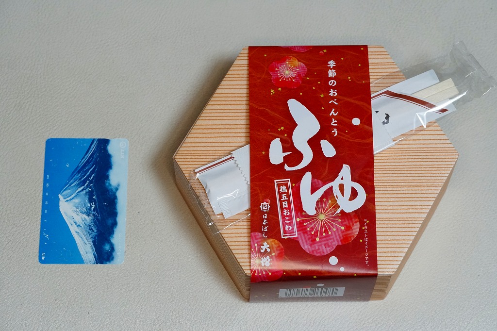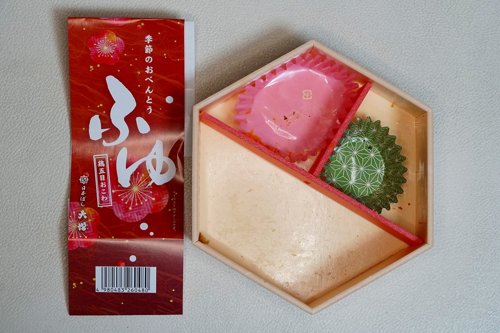 2021(令和3)年の12月頃に発売か。10年以上続いた季節の駅弁「ほたておこわ弁当」「鮭いくらおこわ弁当」に代わり、12月から2月まで東京で売られる、駅やデパ地下のお弁当。正六角形の容器を3つに仕切り、半分に鶏五目おこわを、残りの半分にカボチャやれんこんやがんもなどの煮物を、残りに蒲鉾と玉子焼とホタテ風フライとひじき煮を詰める。分量と構成と品質が確保された、東京では貴重な、1,000円でお釣りが来る駅弁。翌シーズンの2023年12月から2024年1月までは、御飯が赤飯になった。2024年12月に「季節のおべんとう鶏五目おこわ」へリニューアル。