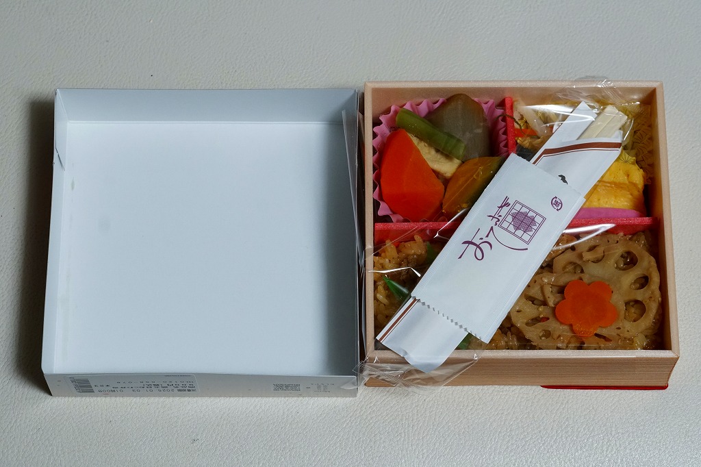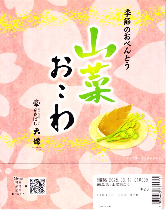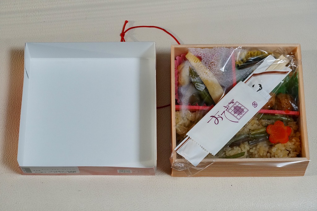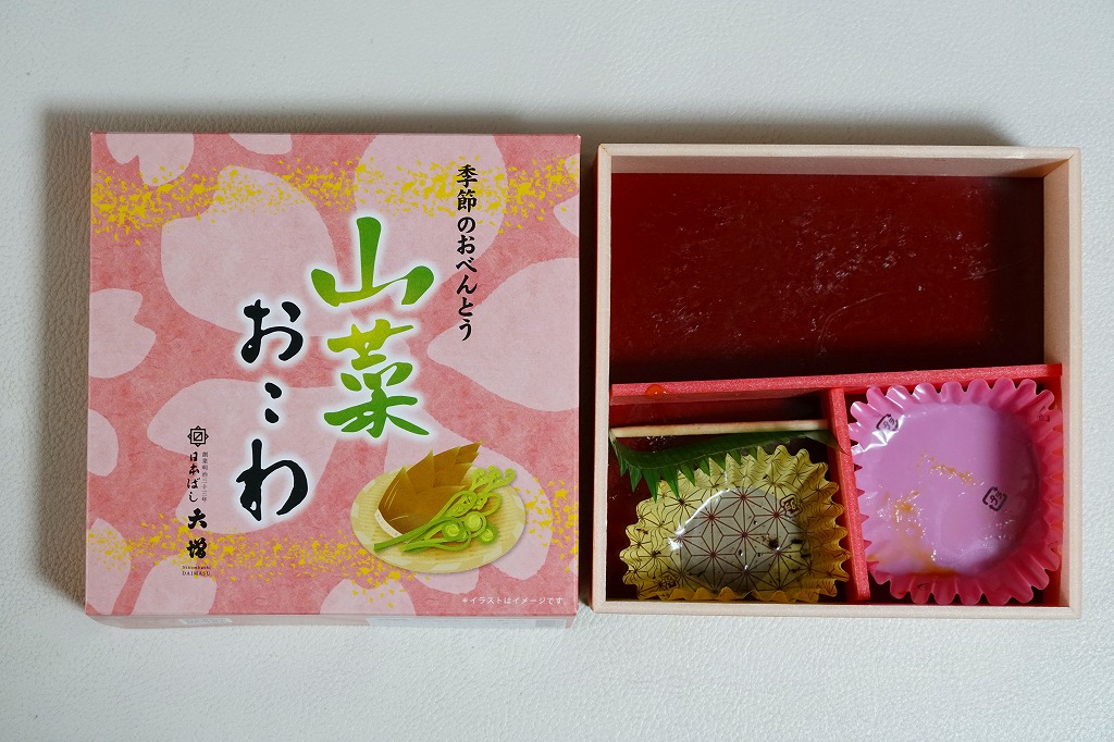 従前の春季駅弁「季節のおべんとう春日和」を、2025年3月にリニューアル。正六角形の容器を正方形に変え、商品名を季節から中身に変え、引き続き東京駅弁というよりは「日本ばし大増」ブランドの仕出し弁当かデパ地下弁当の姿をする。中身は山菜おこわに花にんじんを載せ、かぼちゃやたけのこなどの煮物と、かまぼこ、玉子焼、ひじき煮、鶏つくねを添えるもの。この物価高の中で、千円を切る価格が維持された。安心感と実用的な腹六分目は、下記の冬版と同じ感じ。