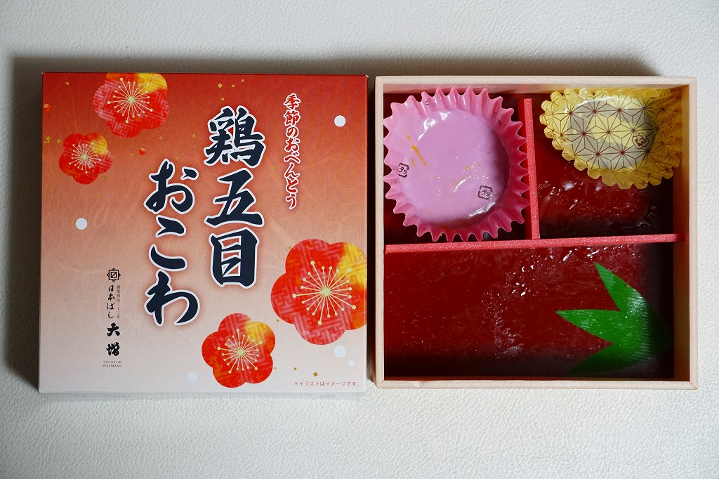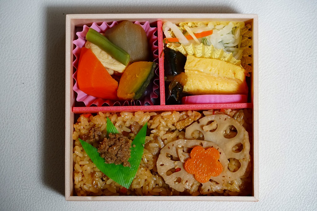 従前の冬季駅弁「季節のおべんとうふゆ」を、2024年12月にリニューアル。正六角形の容器を正方形に変え、商品名を季節から中身に変え、引き続き東京駅弁というよりは「日本ばし大増」ブランドの仕出し弁当かデパ地下弁当の姿をする。中身は鶏五目おこわに花にんじんとれんこんきんぴらと鶏そぼろ味噌味を載せ、かぼちゃやごぼうなどの煮物と、かまぼこ、玉子焼、大根サラダ、にしん昆布巻を添えるもので、これは2年前のものに似ている。この物価高の中で、900円の価格が据え置かれた。安心感と実用的な腹六分目は、下記の秋版と同じ感じ。